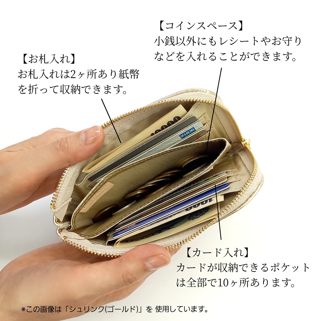 二つ折りにしたお札が入るスペースが2か所、カードが入るポケットは10か所あります。