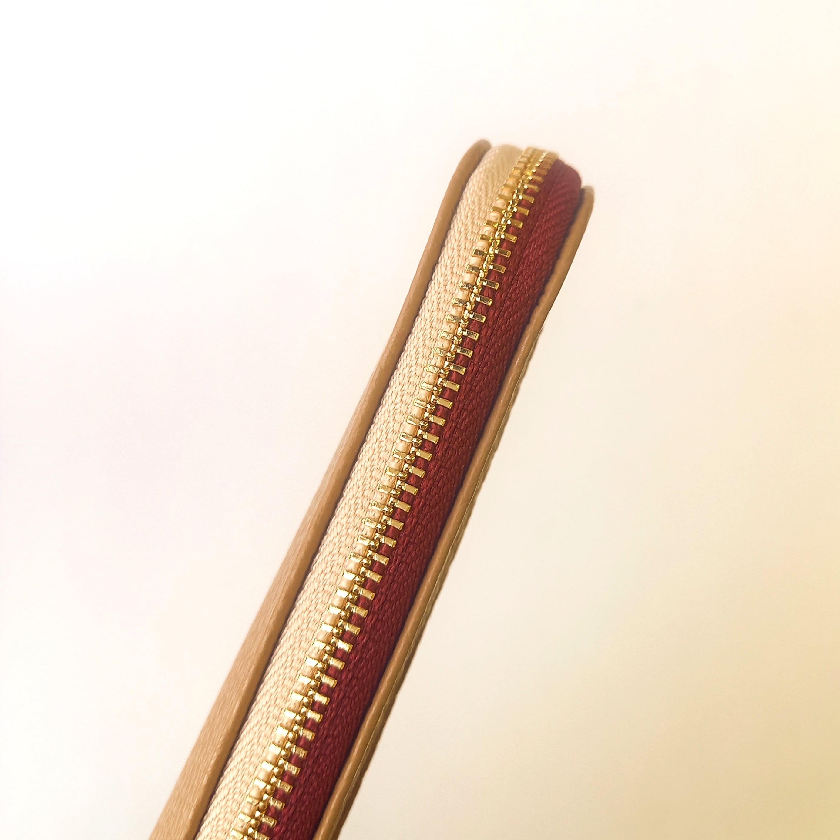 ファスナーのカラーは、ライトベージュ×ワインレッドでトーンを抑えながらも凛とした印象にしました。