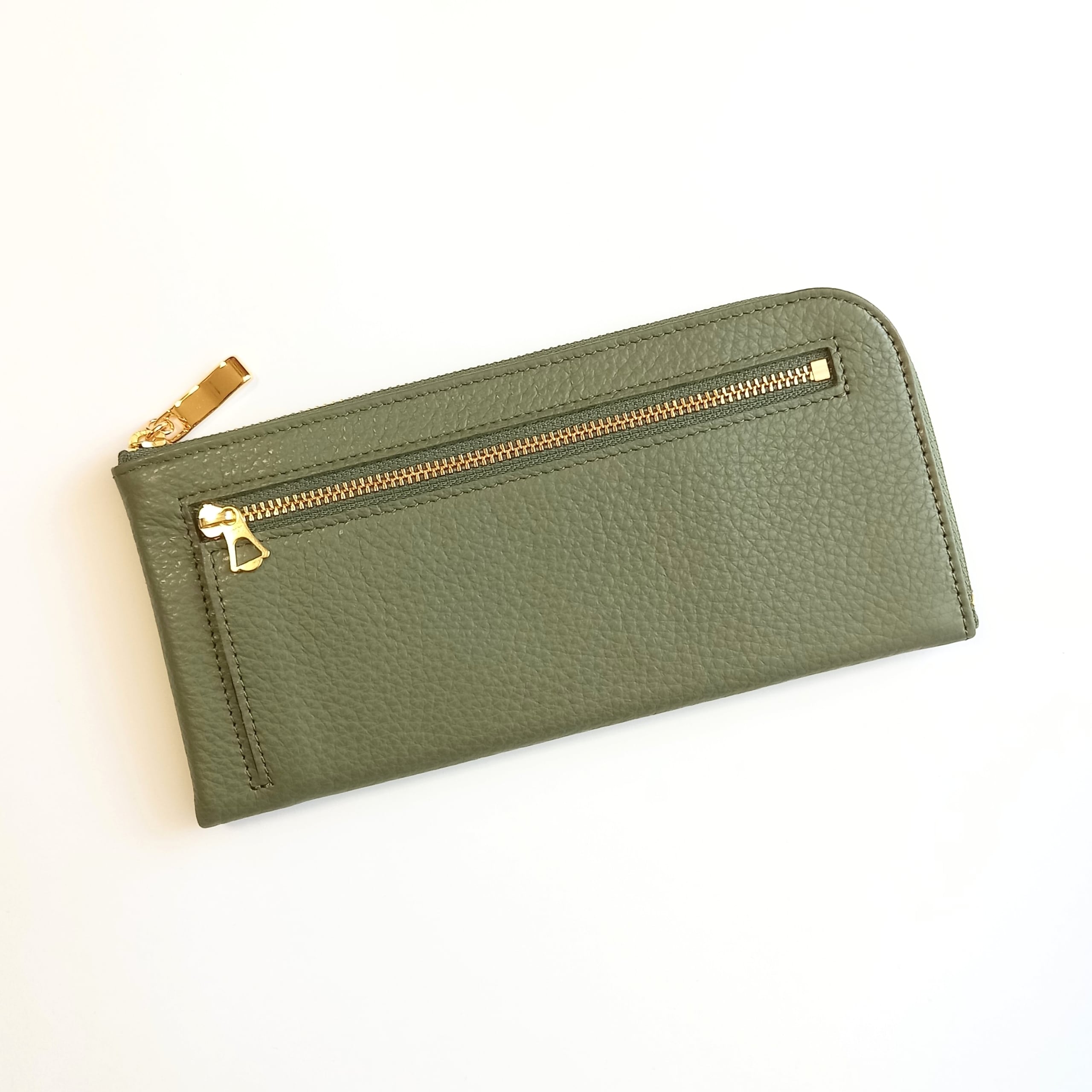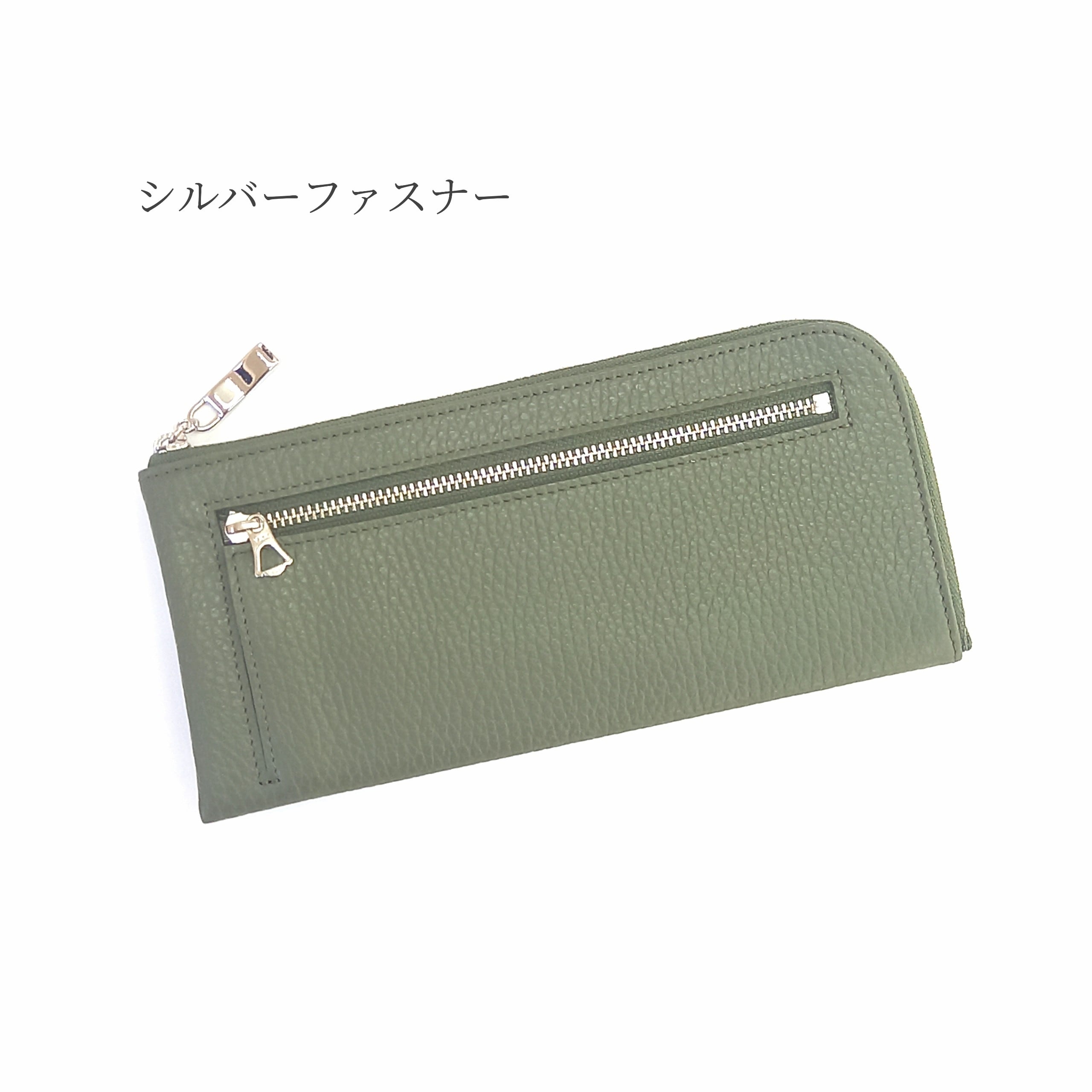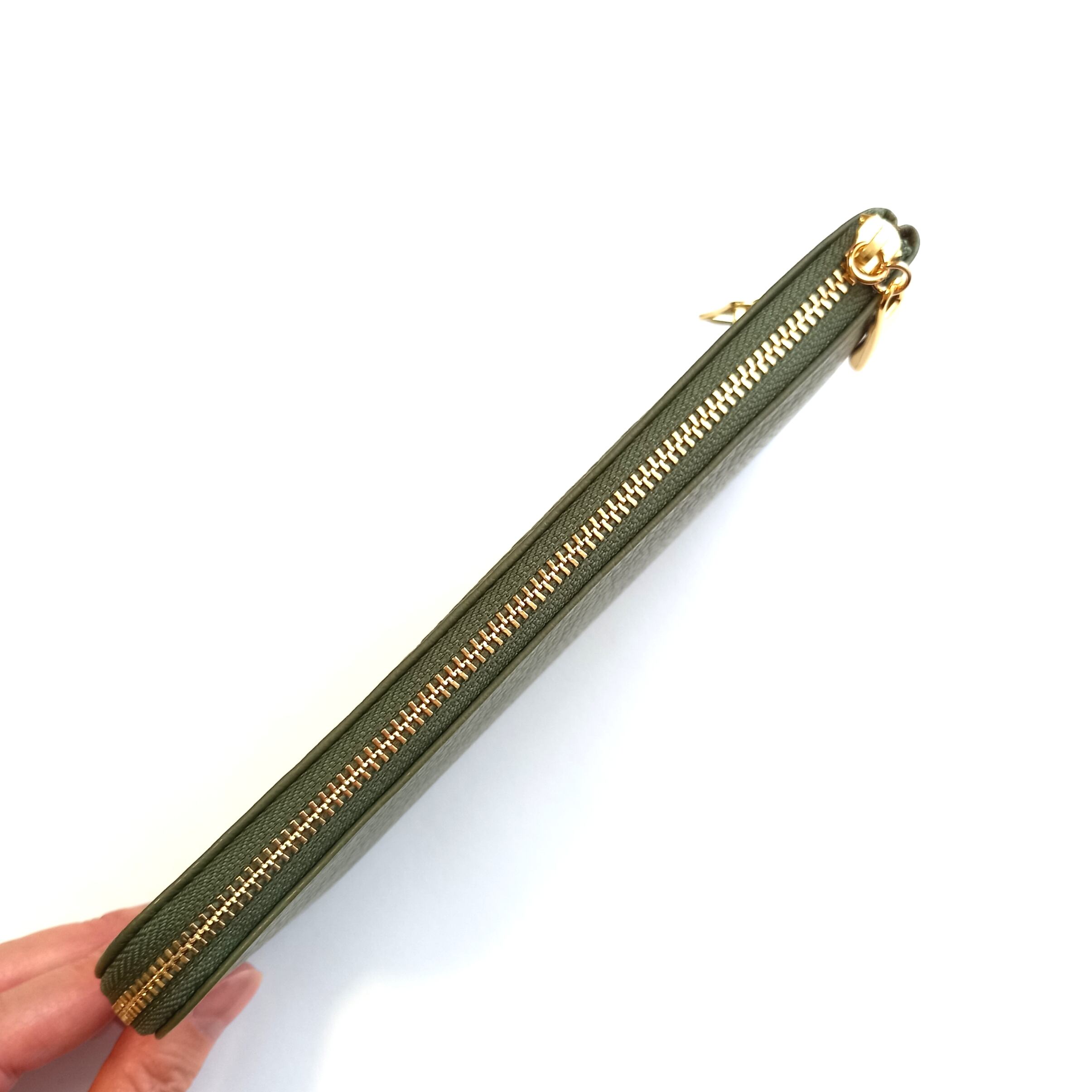 スリムで軽く大容量な長財布(オリーブグリーン)カード入れは14か所!高級イタリアンレザー◇牛革シュリンク◇L字ファスナー財布【かわつむ】
