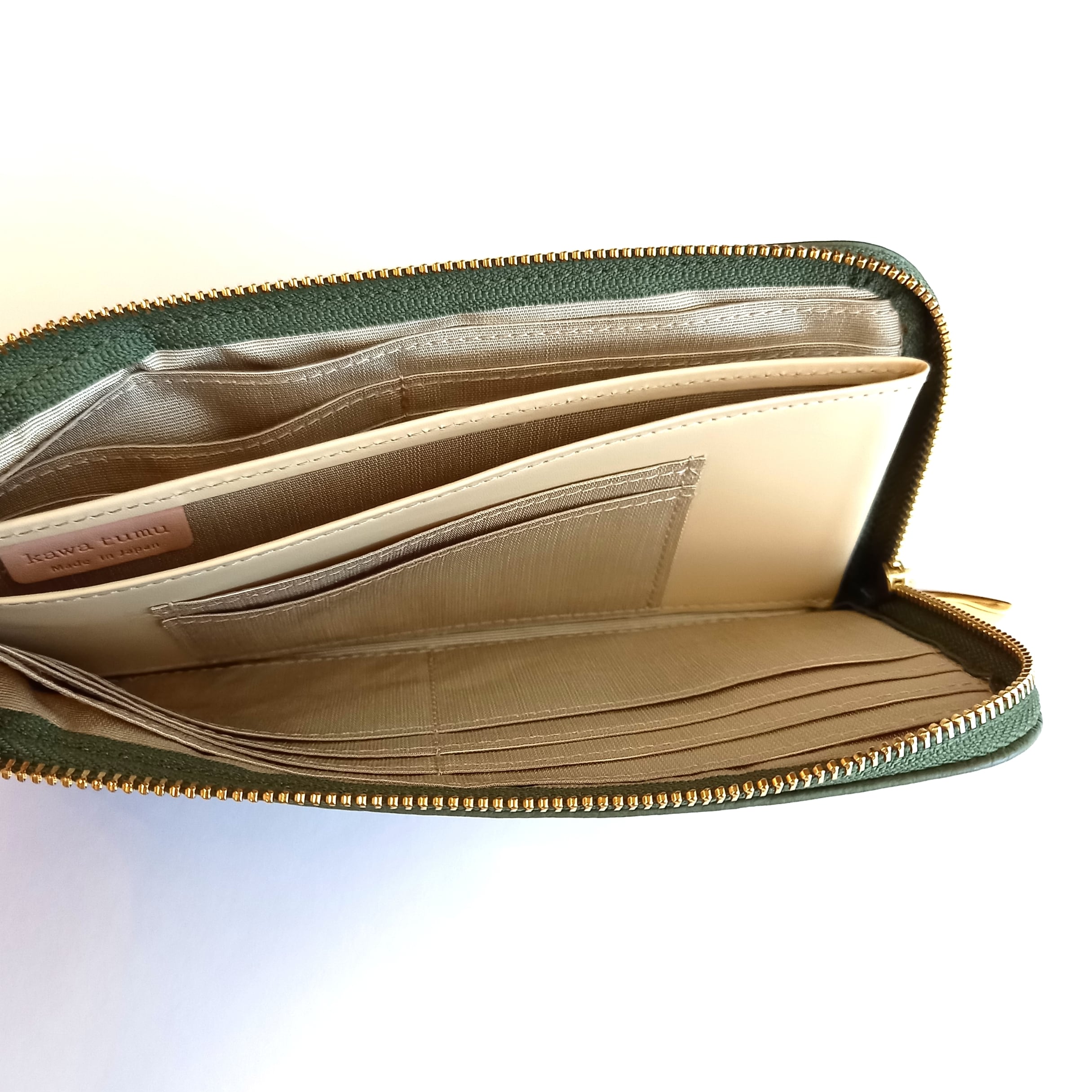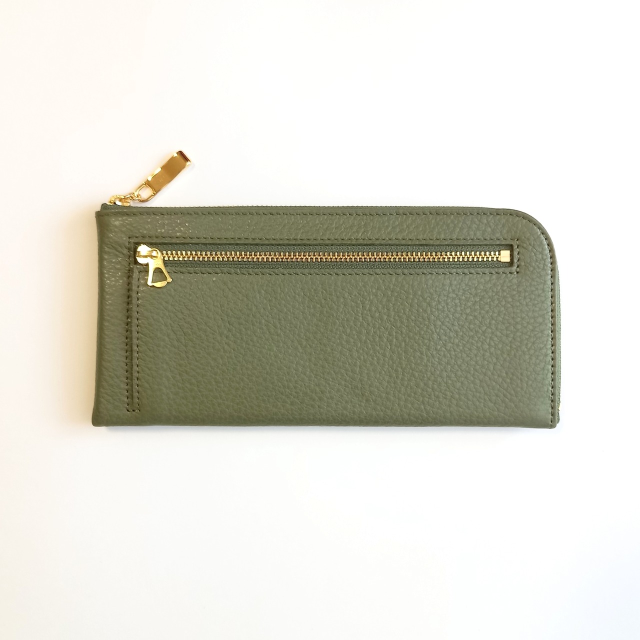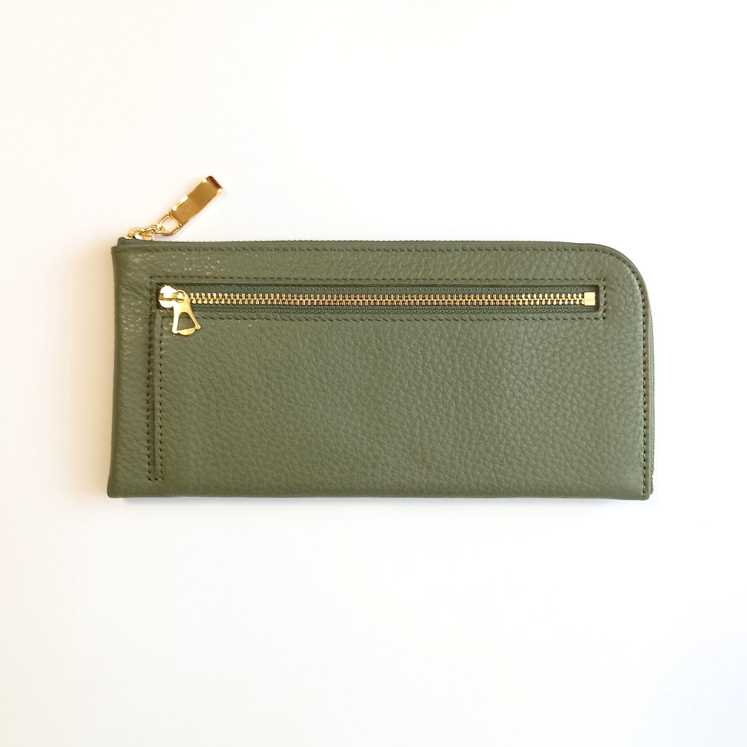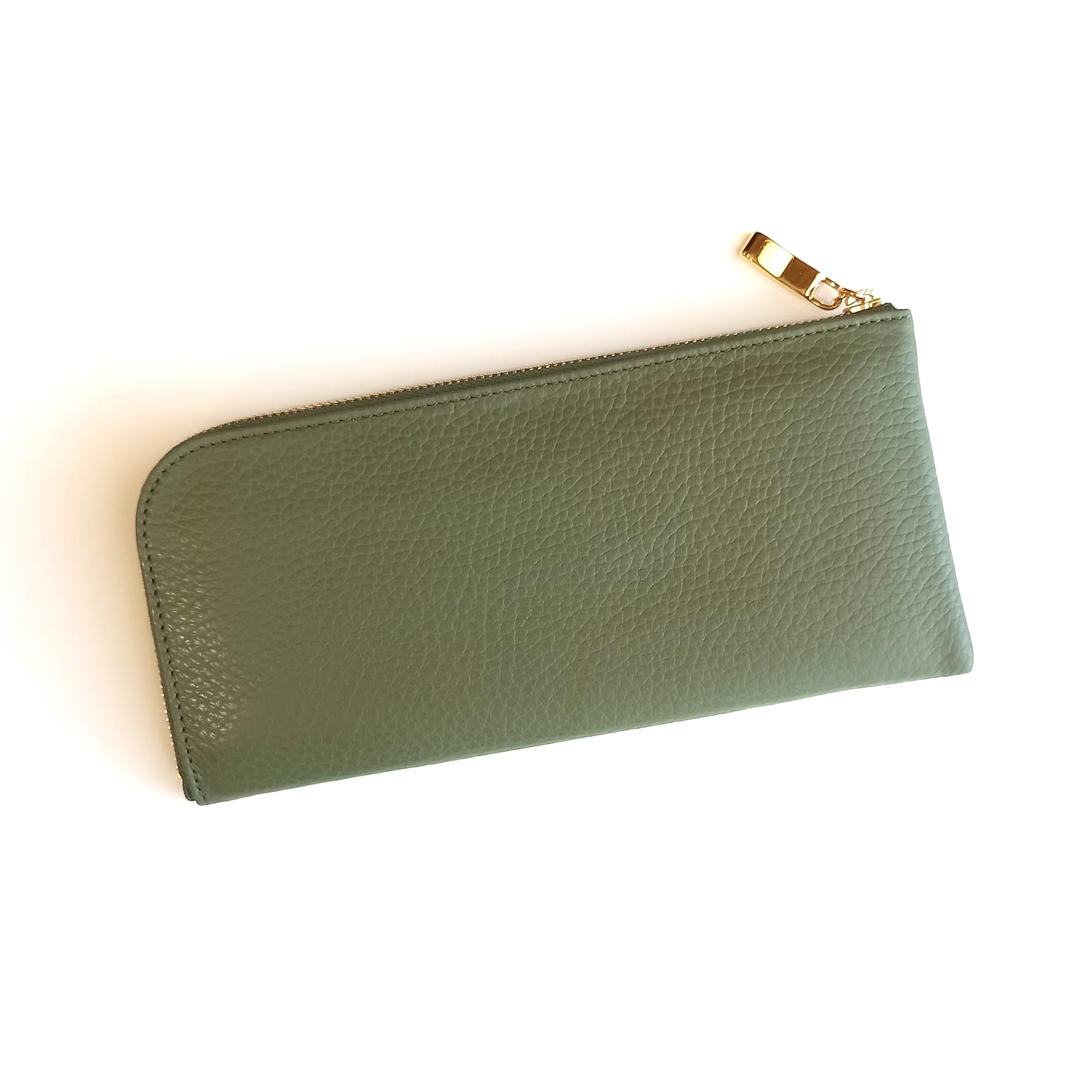 スリムで軽く大容量な長財布(オリーブグリーン)カード入れは14か所!高級イタリアンレザー◇牛革シュリンク◇L字ファスナー財布【かわつむ】