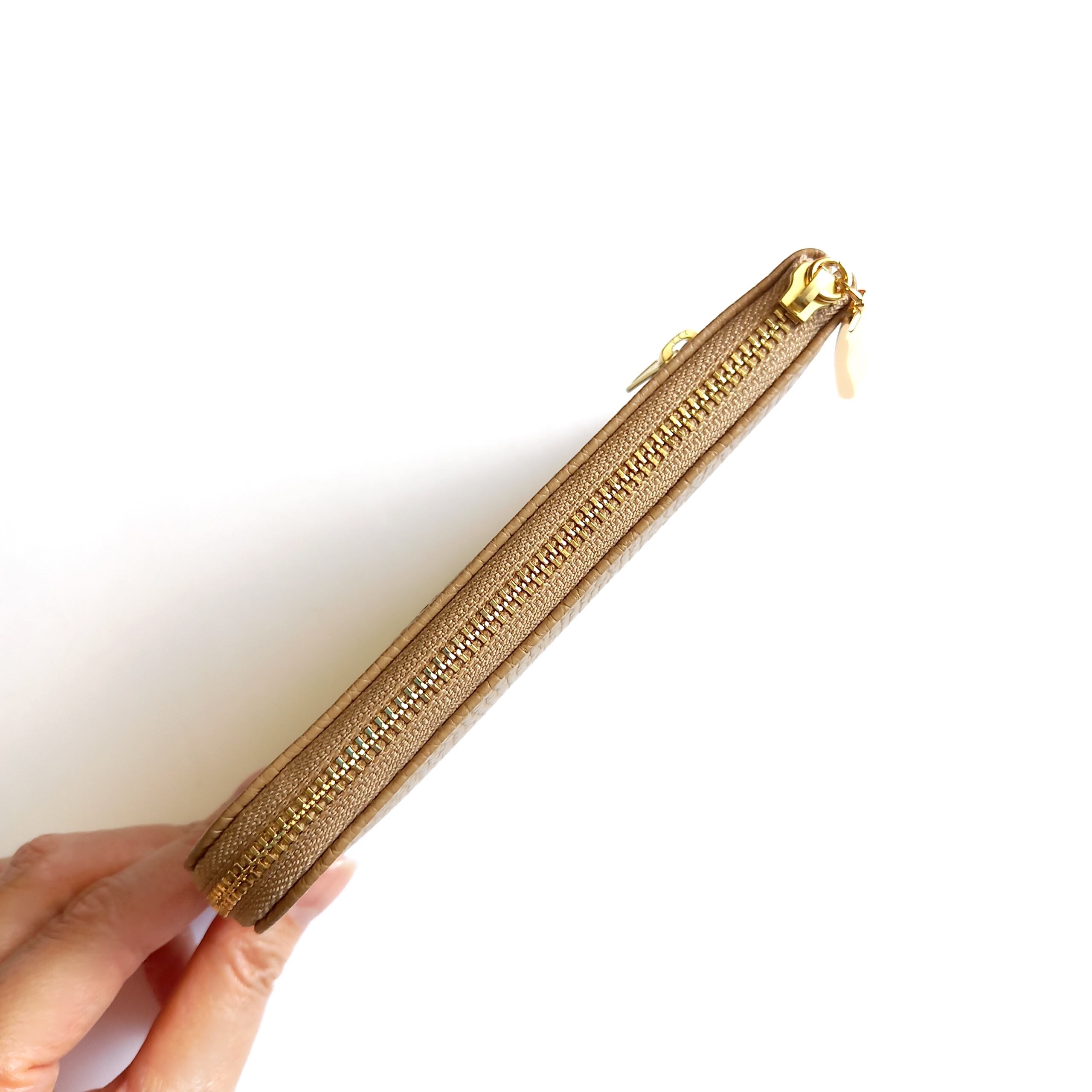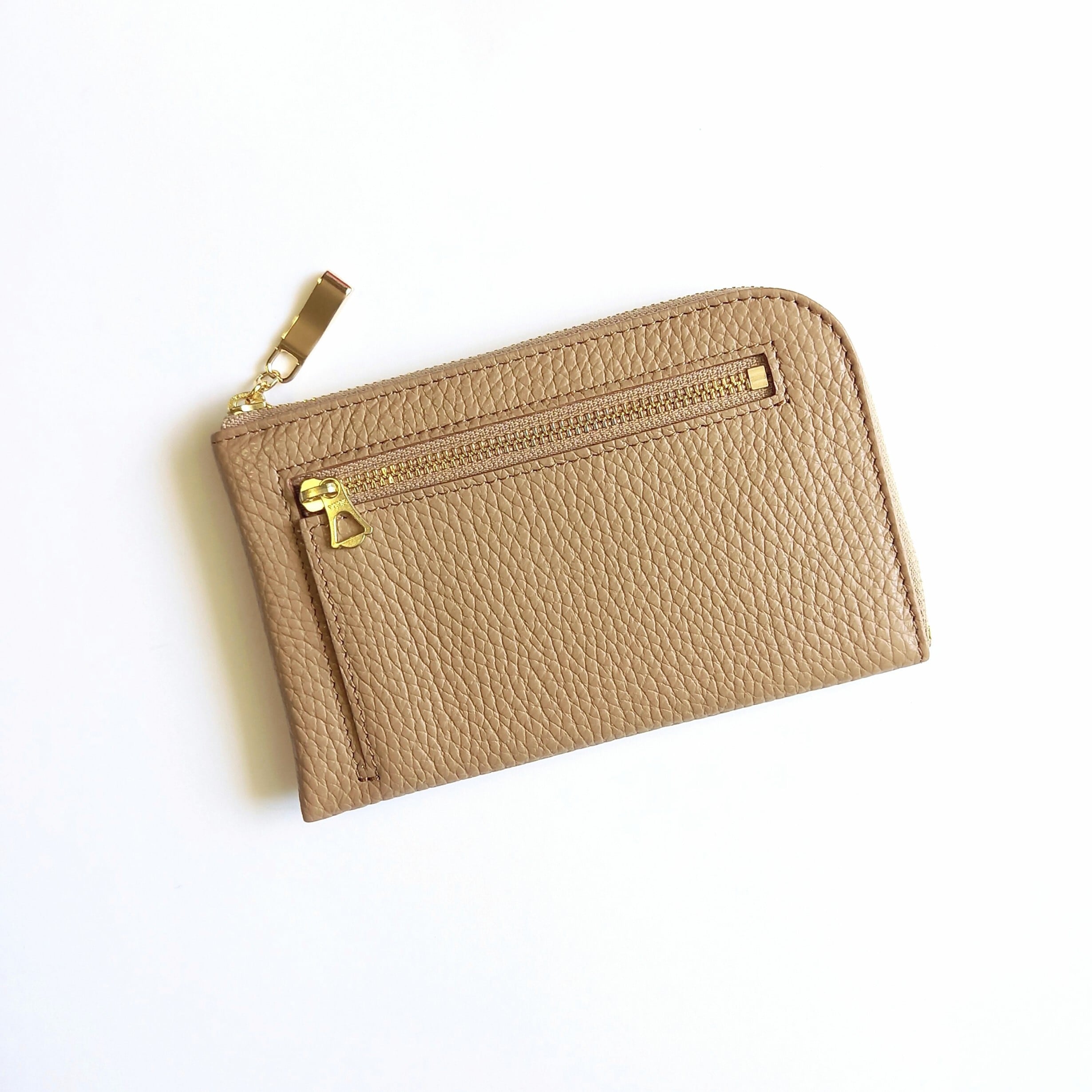 スリムで軽いミニ財布(カフェベージュ)高級イタリアンレザー◇カード入れは10か所!牛革シュリンク型押し◇コンパクト L字ファスナー財布