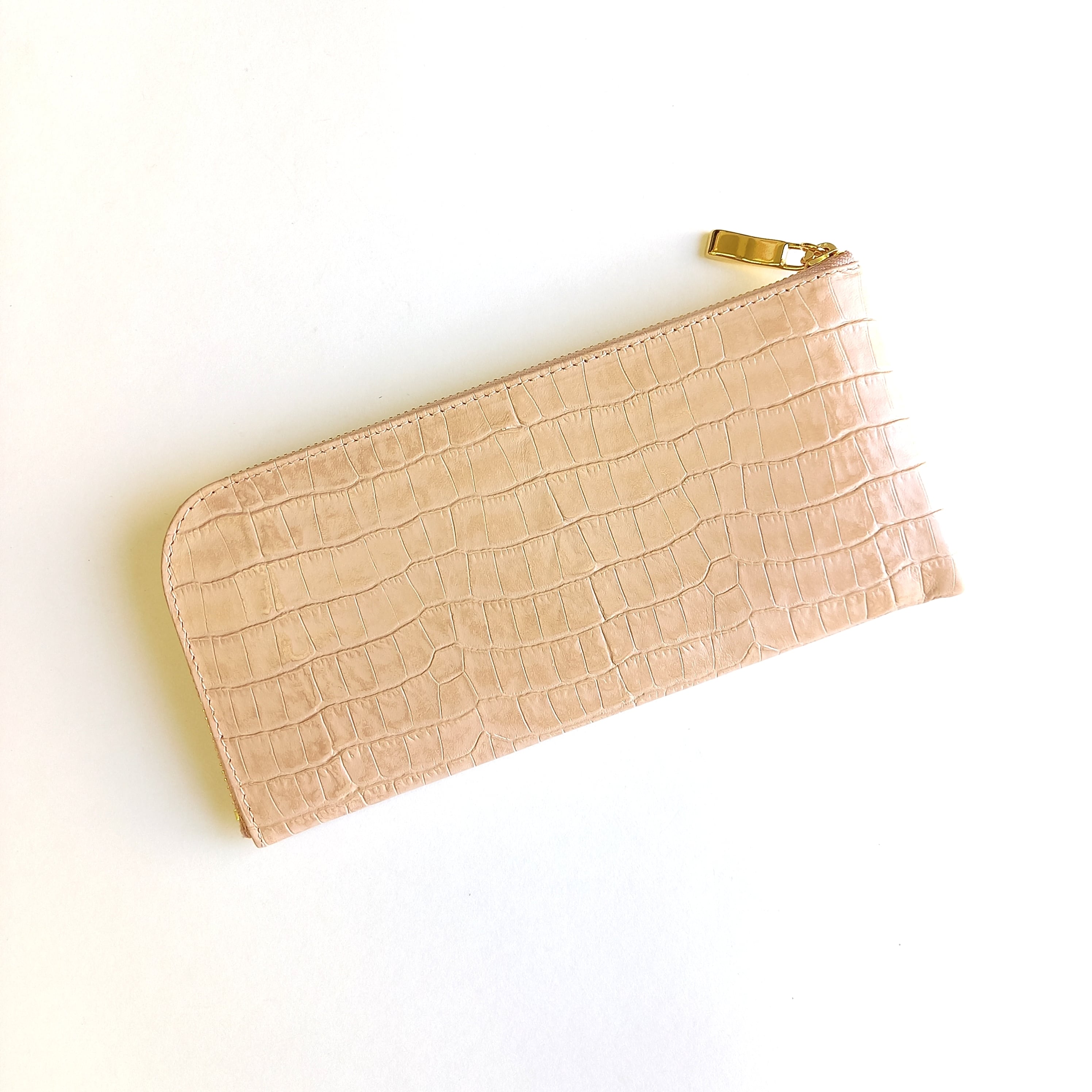 軽くて薄いのに大容量なL字ファスナー長財布◇牛革クロコ型押し(ピンクベージュ) カード入れは14か所!【かわつむ】