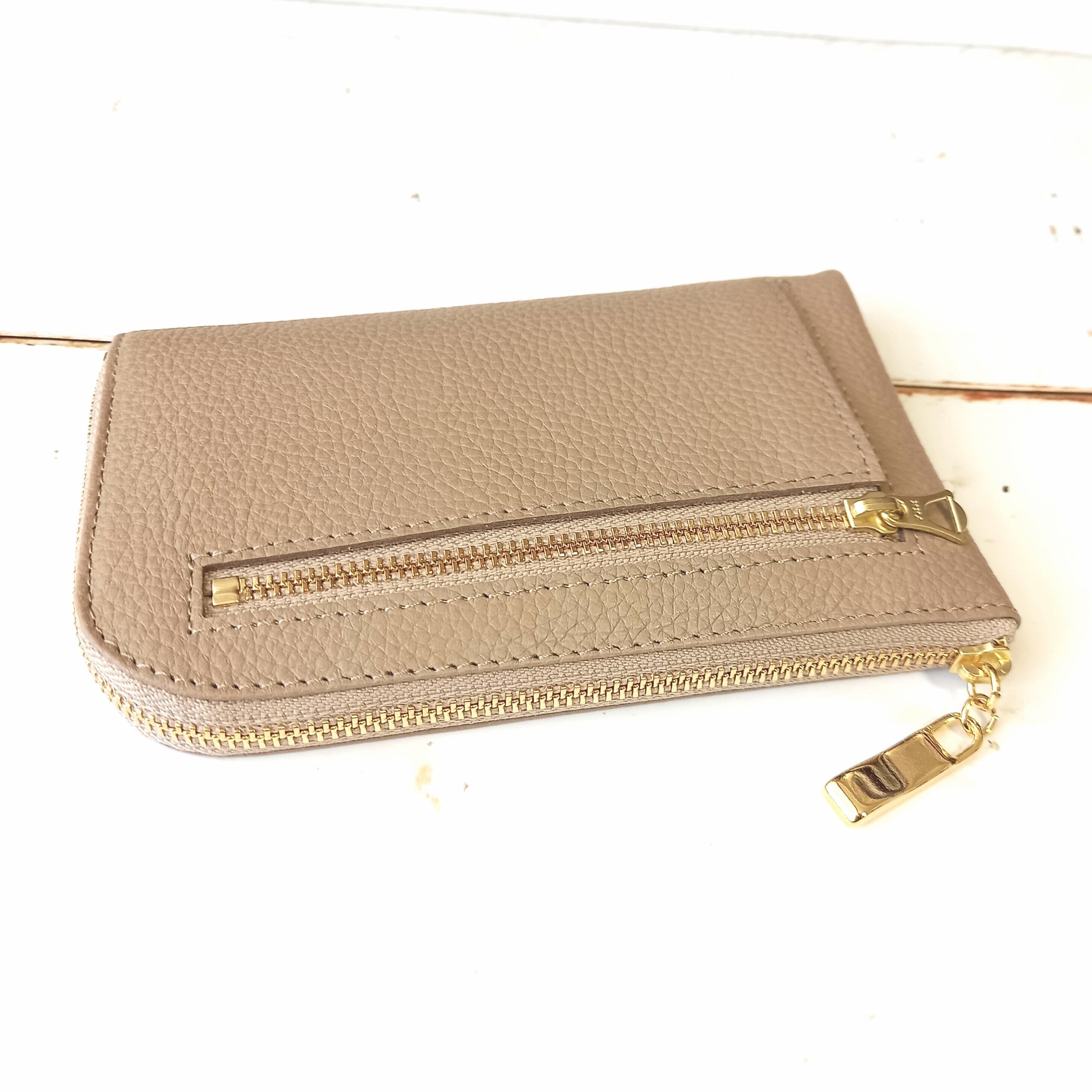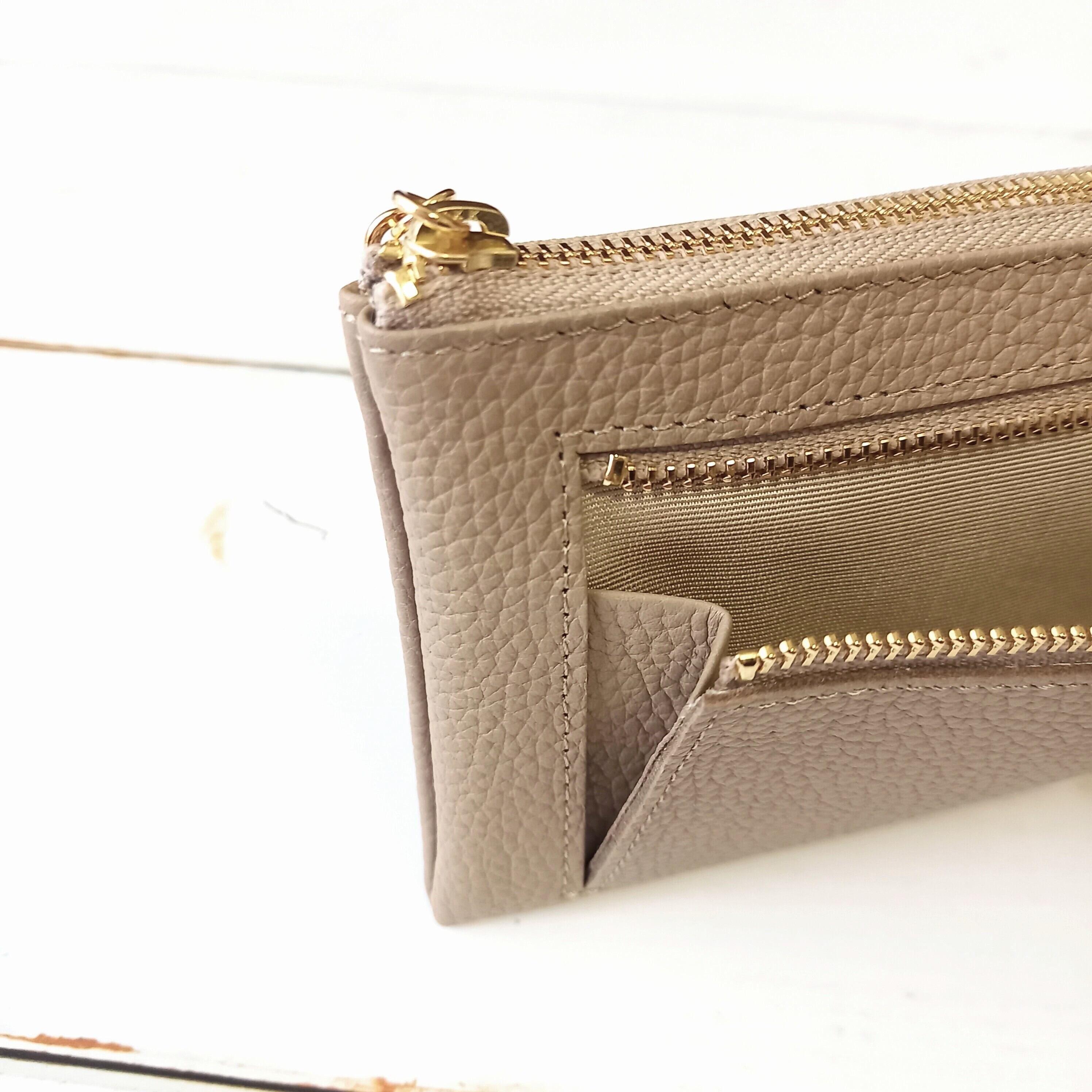 スリムで軽いミニ財布(くすみベージュ)10枚カードポケット◇国産牛革シュリンク型押し◇ファスナー選べる【かわつむ】