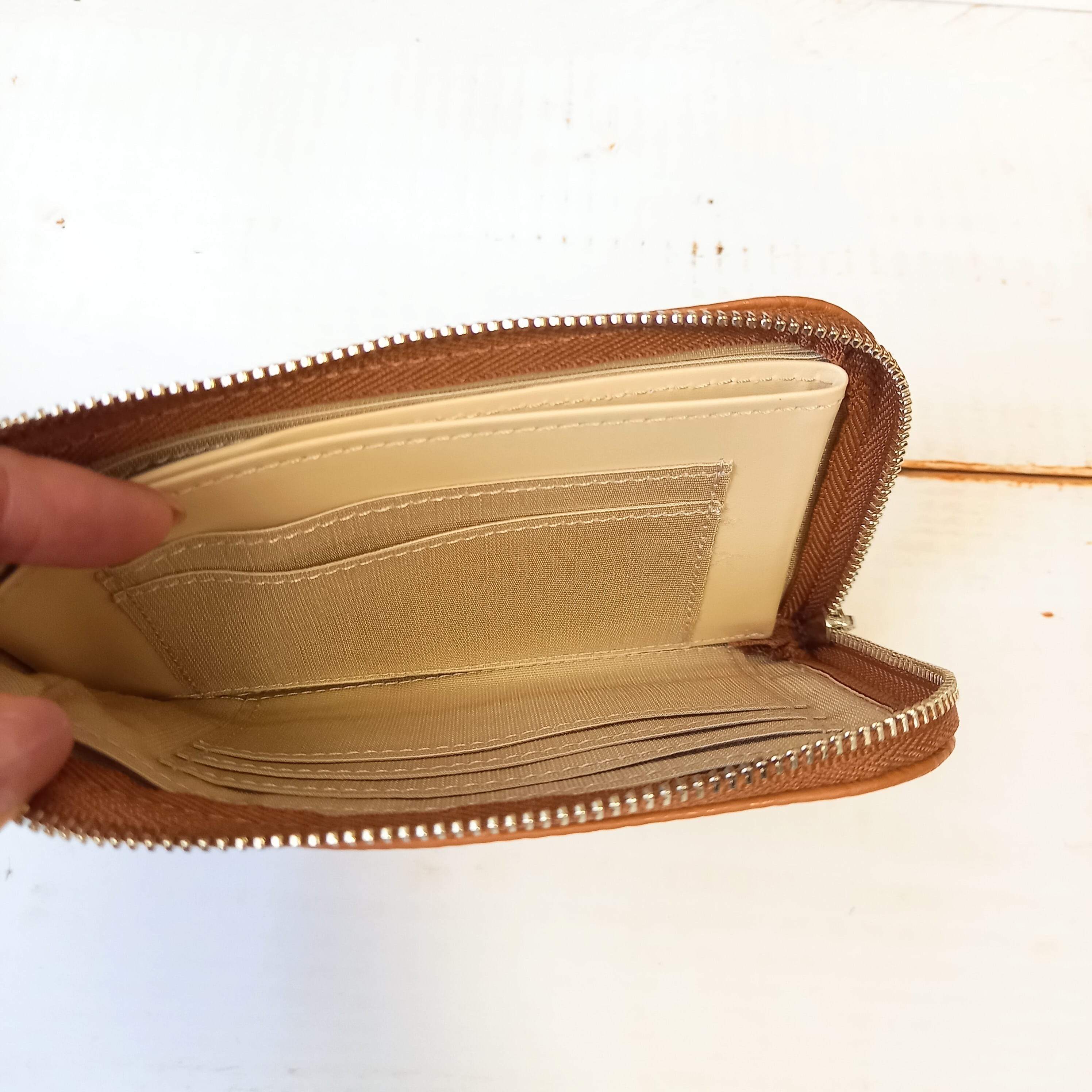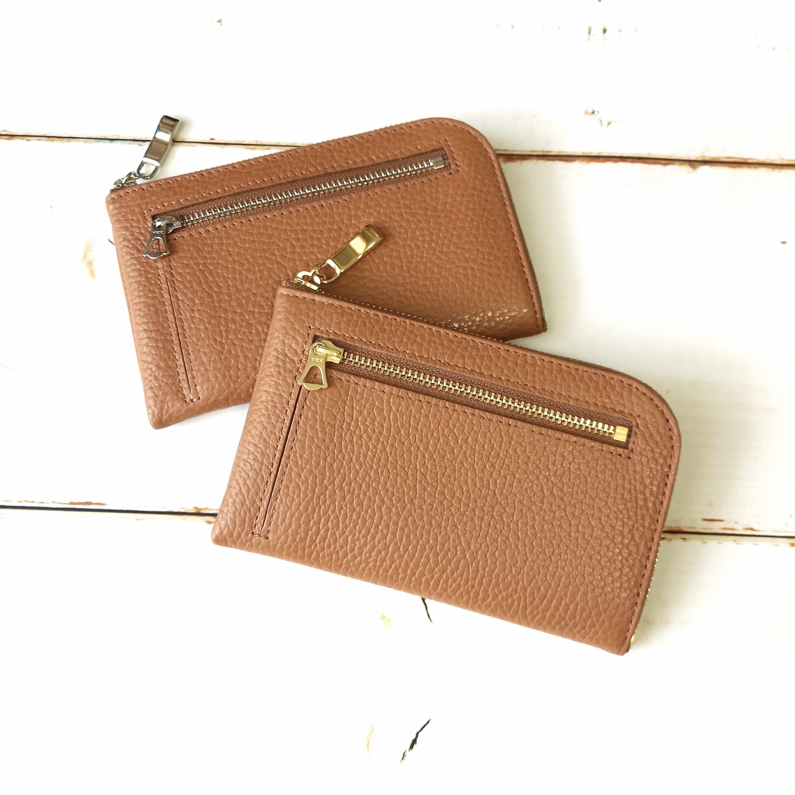 スリムで軽いミニ財布(キャラメル) 10枚カードポケット◇高級イタリアンレザー◇ファスナー選べる【かわつむ】L字ファスナー財布