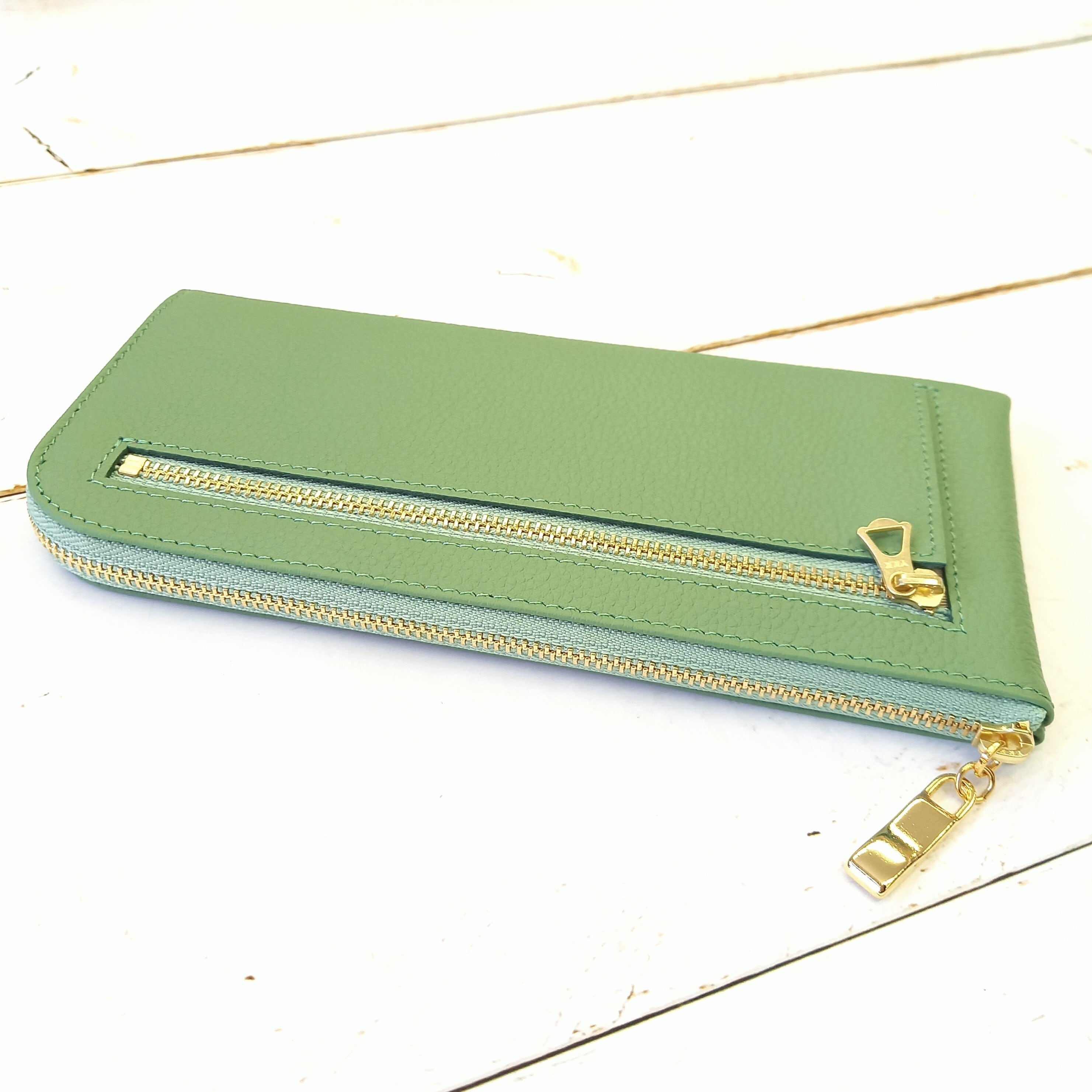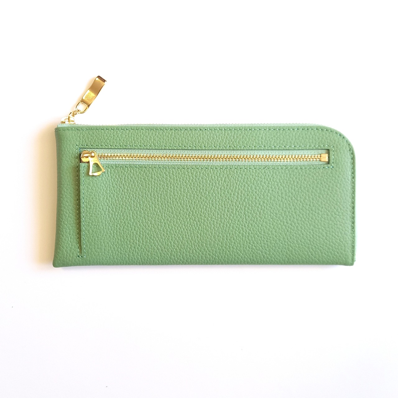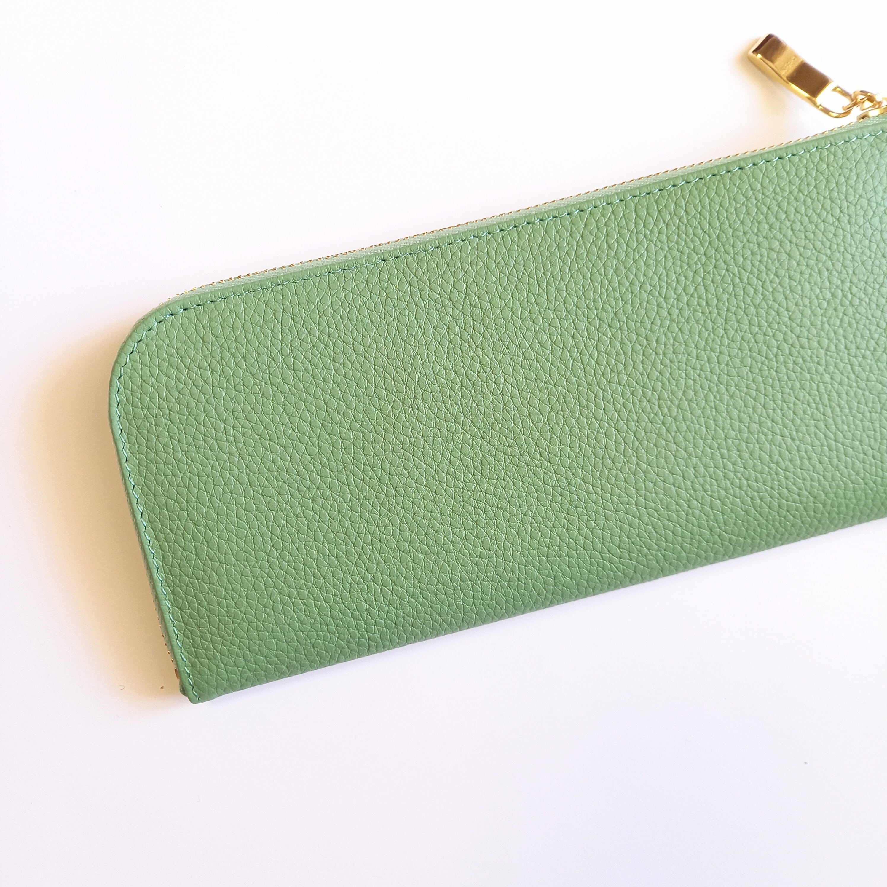 軽くて薄くて大容量なL字ファスナー長財布(ペールグリーン)14枚カードポケット 国産牛革シュリンク型押し