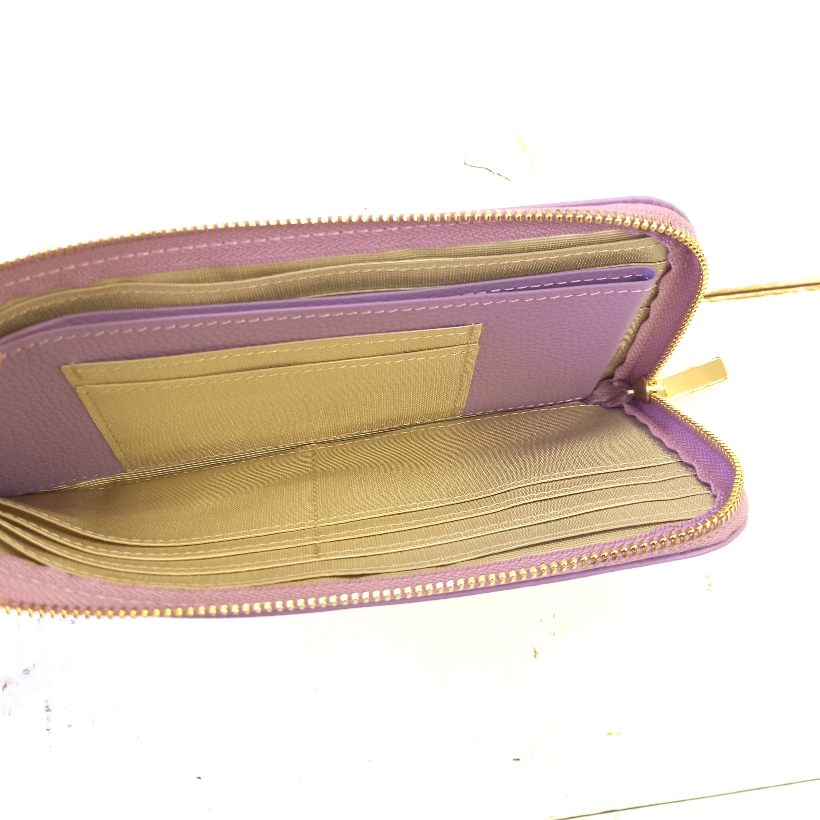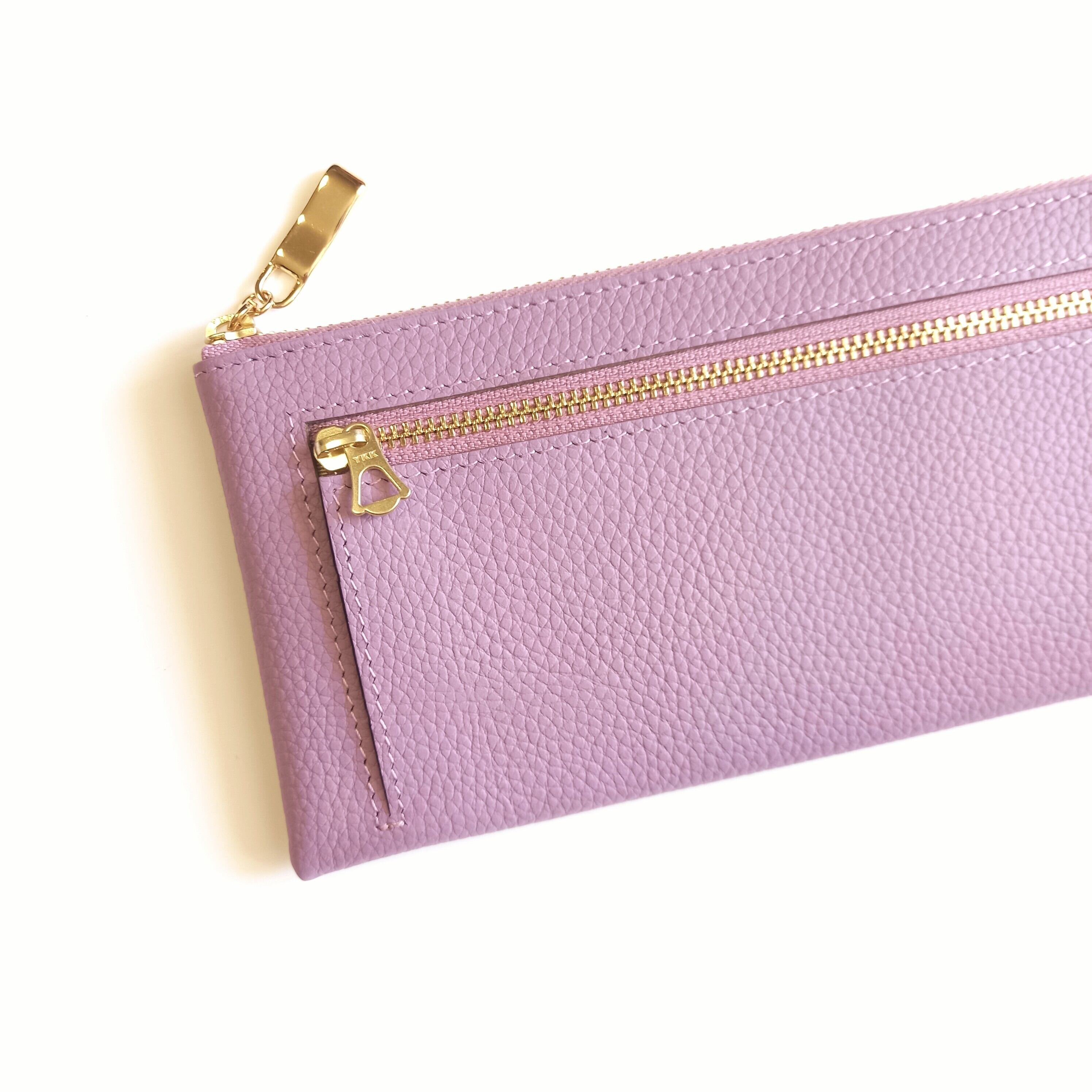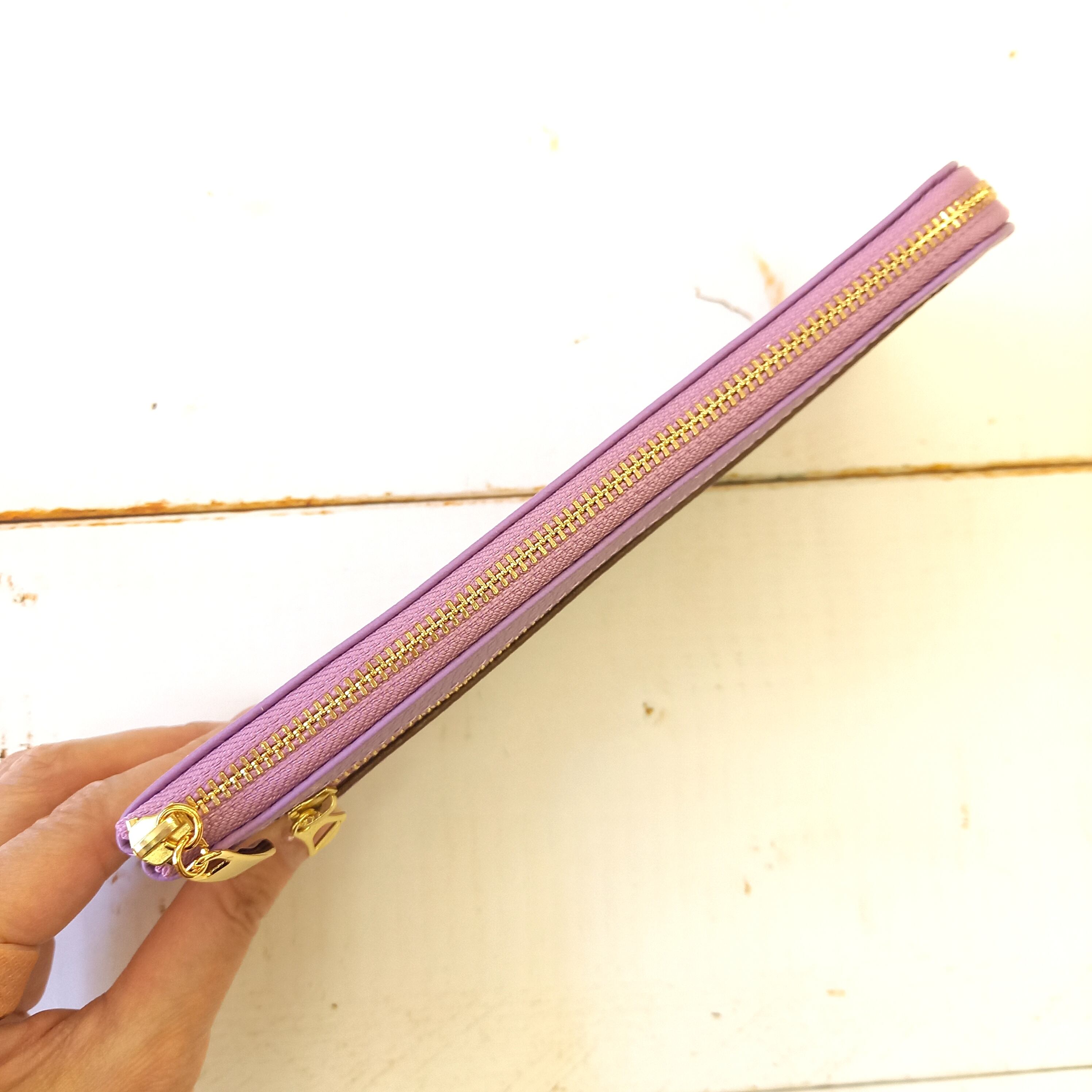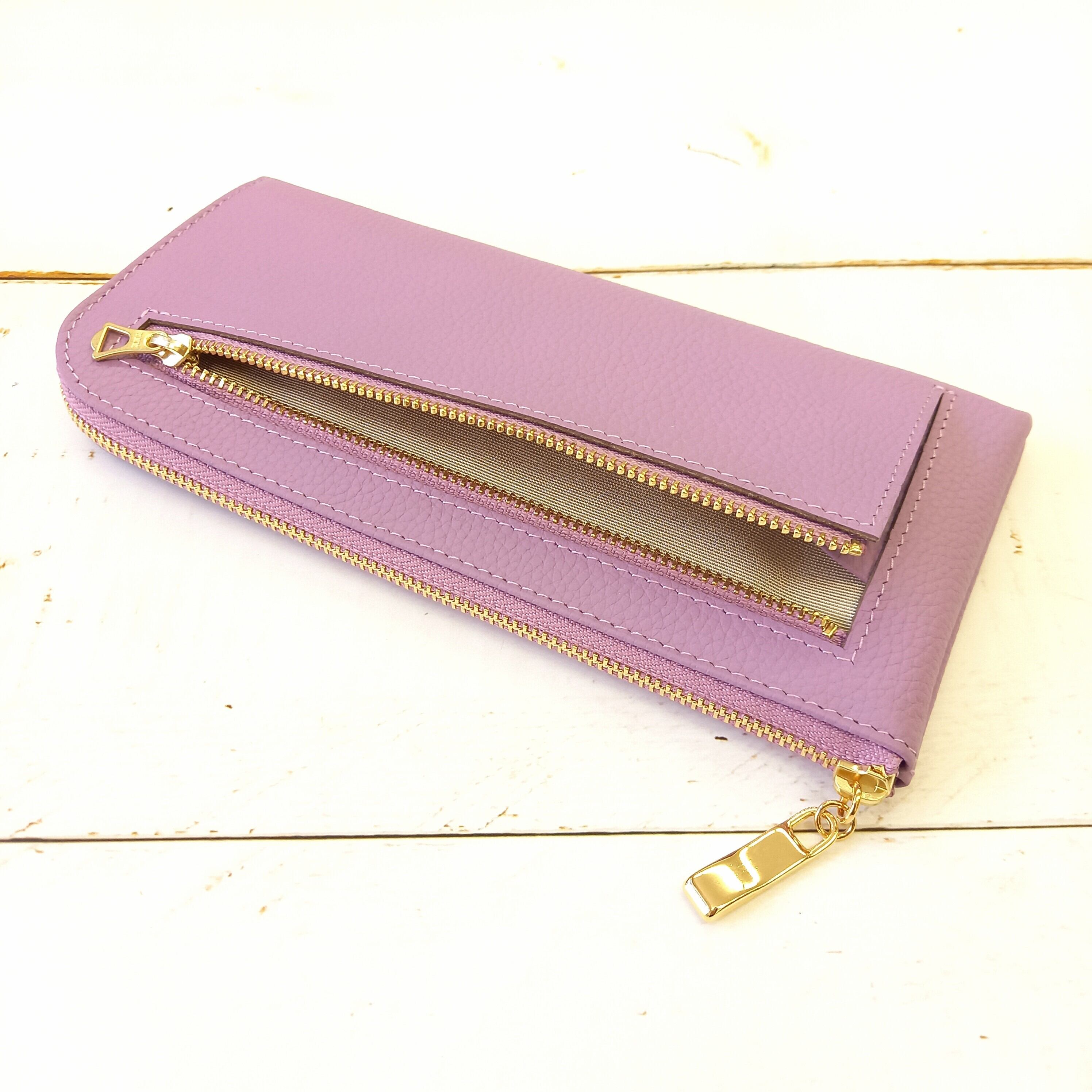 軽くて薄くて大容量!L字ファスナー長財布(ラベンダー)14枚カードポケット 国産牛革シュリンク型押し◇レザー 皮