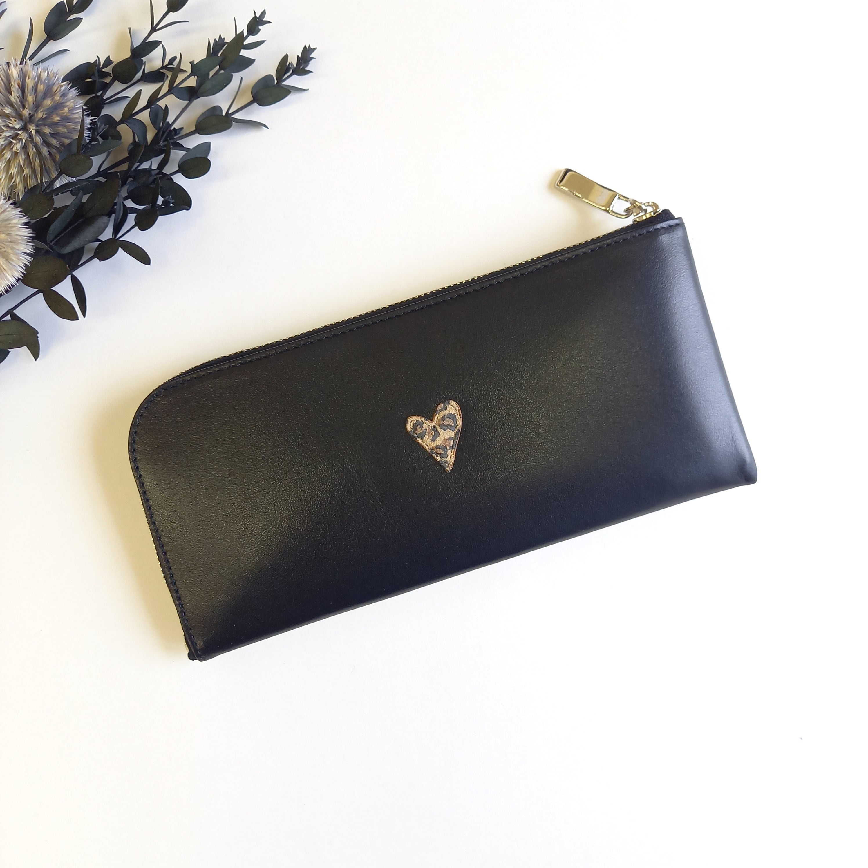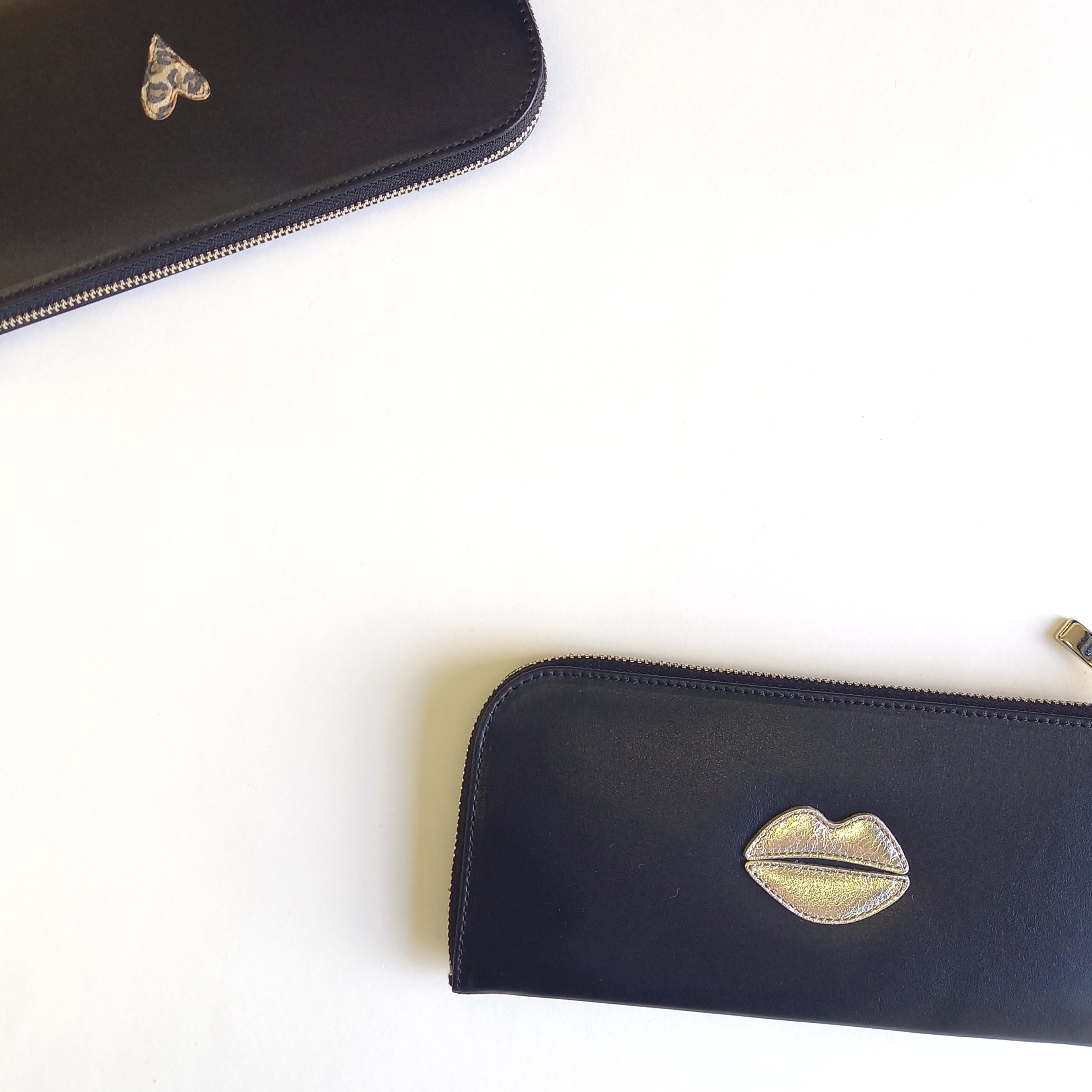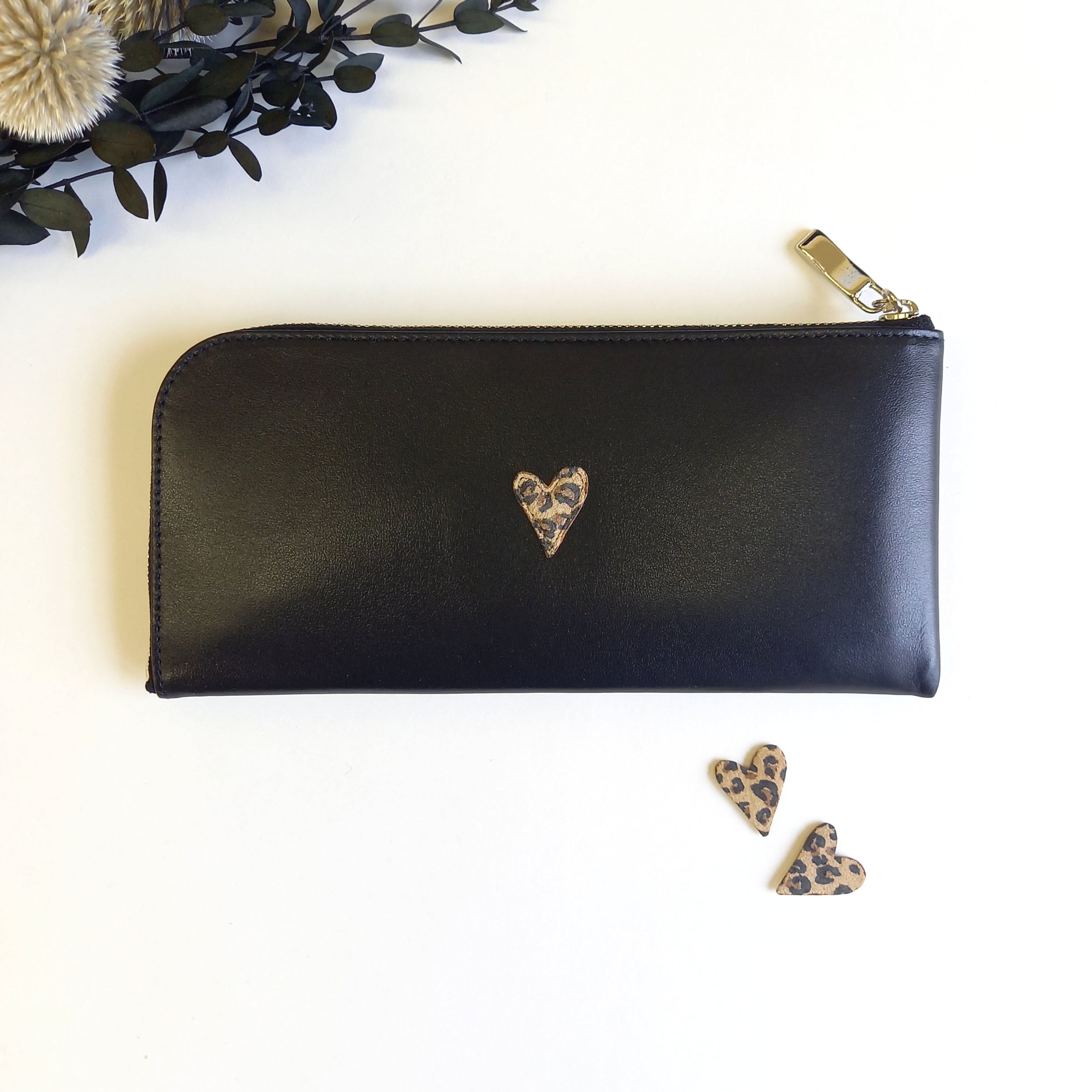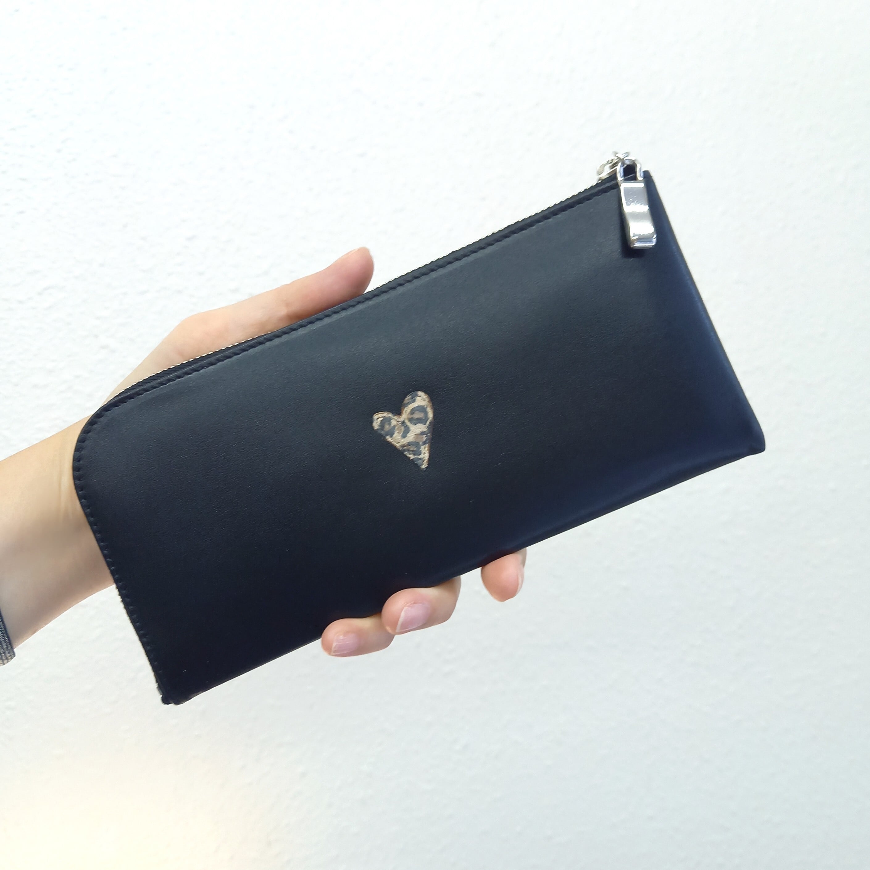 さらっとした高級スムースレザーに、レオパード柄のプチハートモチーフを付けました。