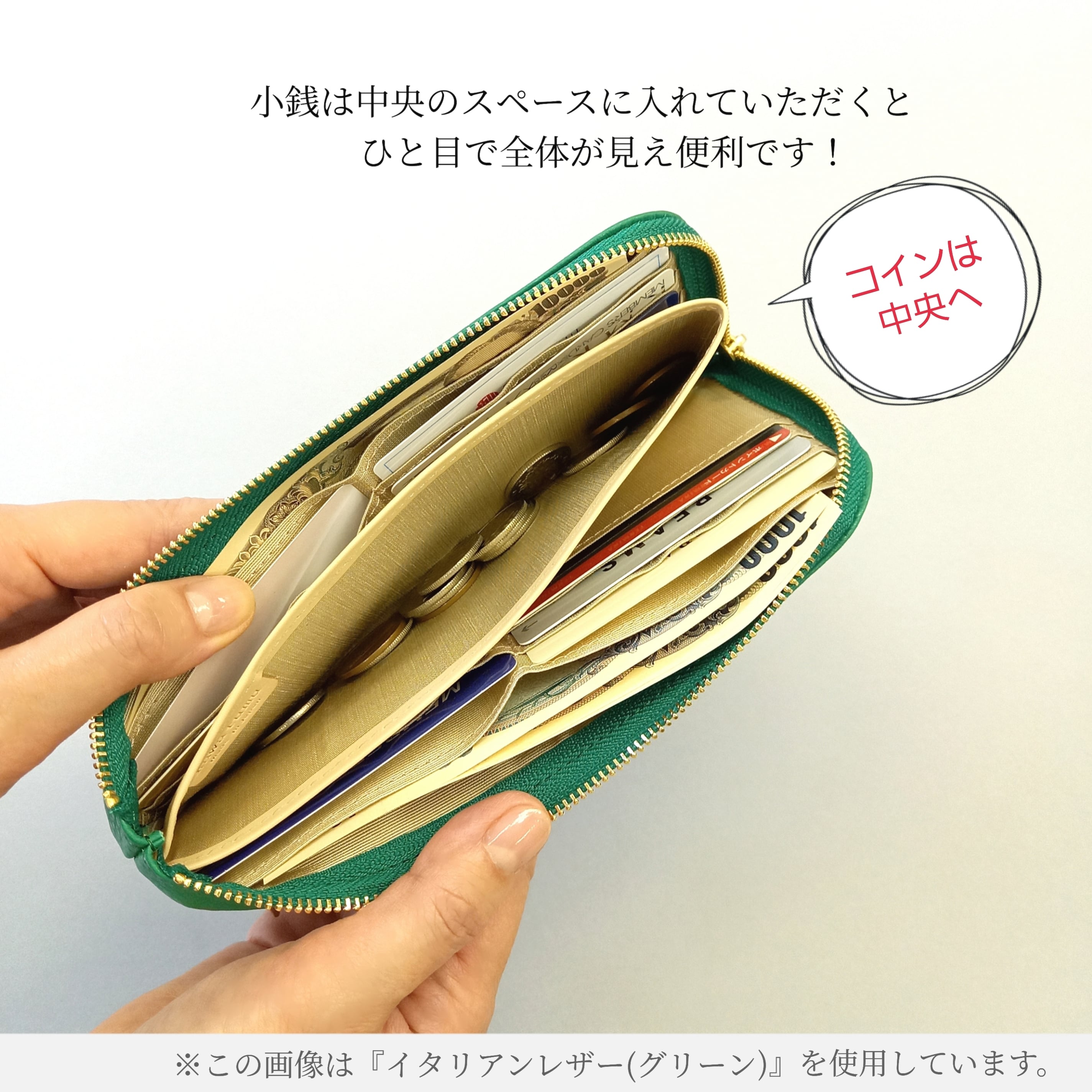 小銭はぜひ内側中央のスペースに入れてお使いください。