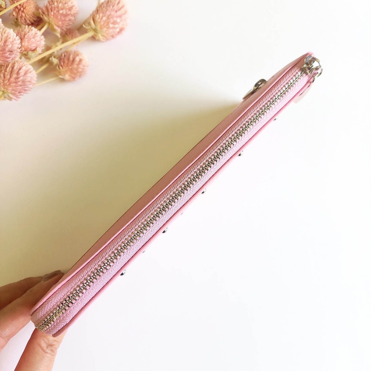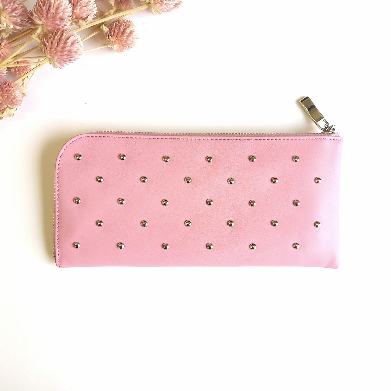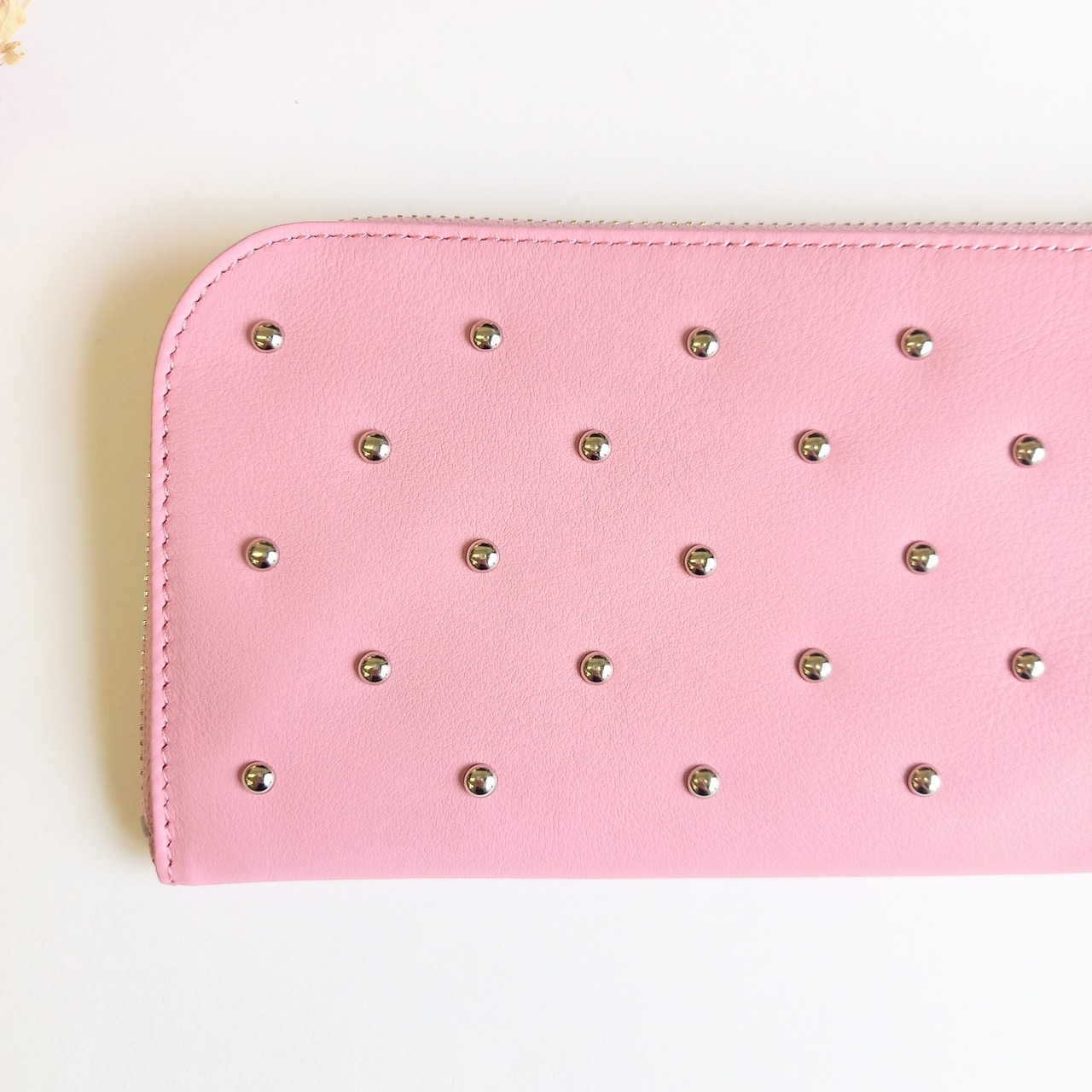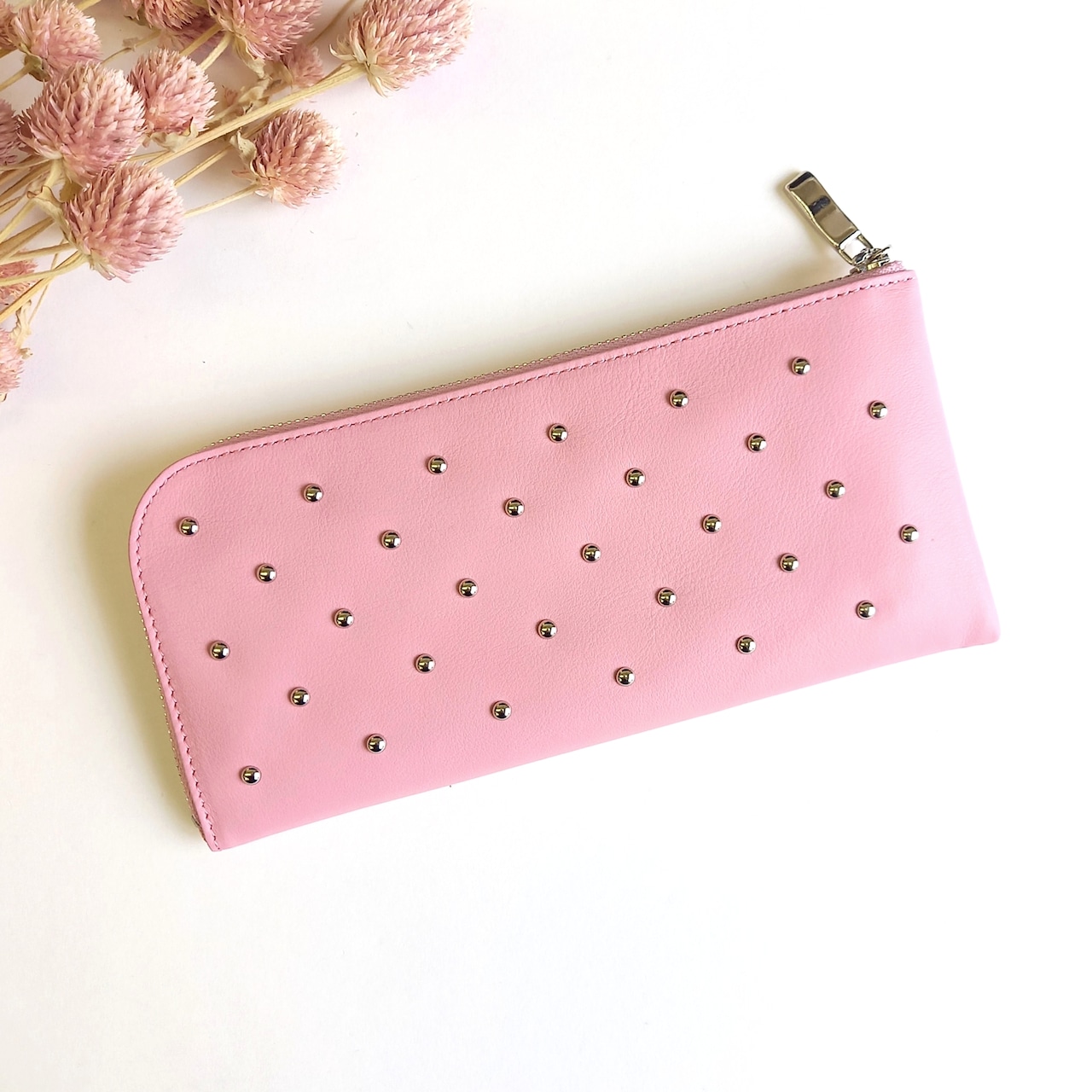 高級レザードットスタッズ(パウダーピンク)◇スリムで軽く大容量な長財布◇14枚カードタイプ◇牛革スムース【送料無料】