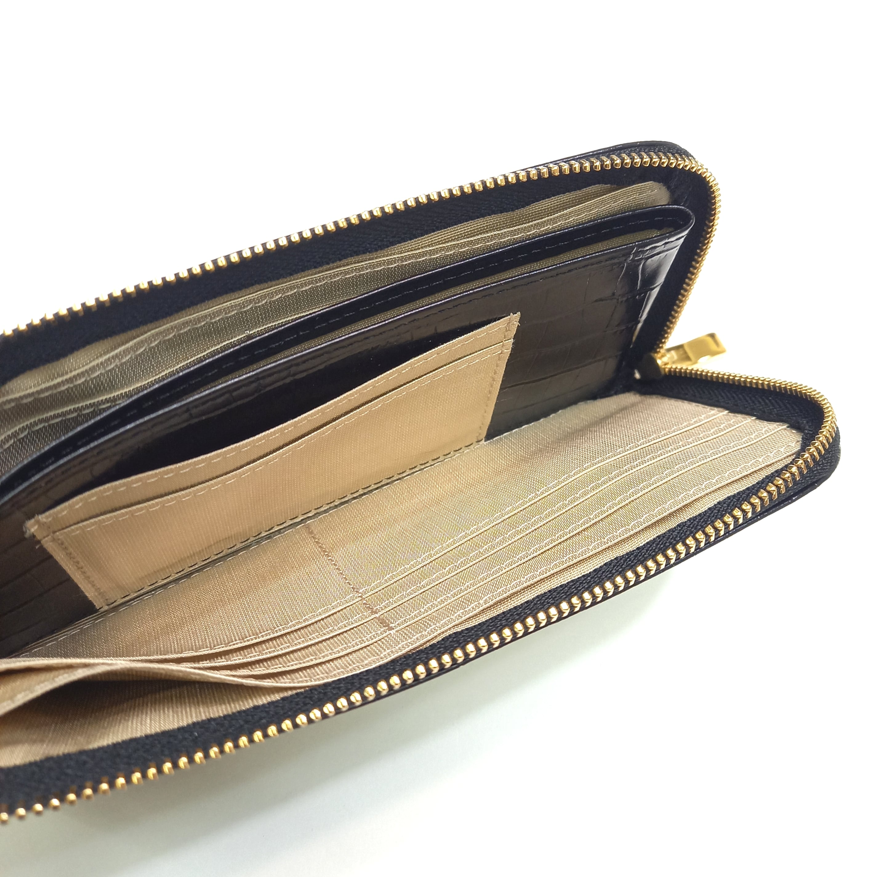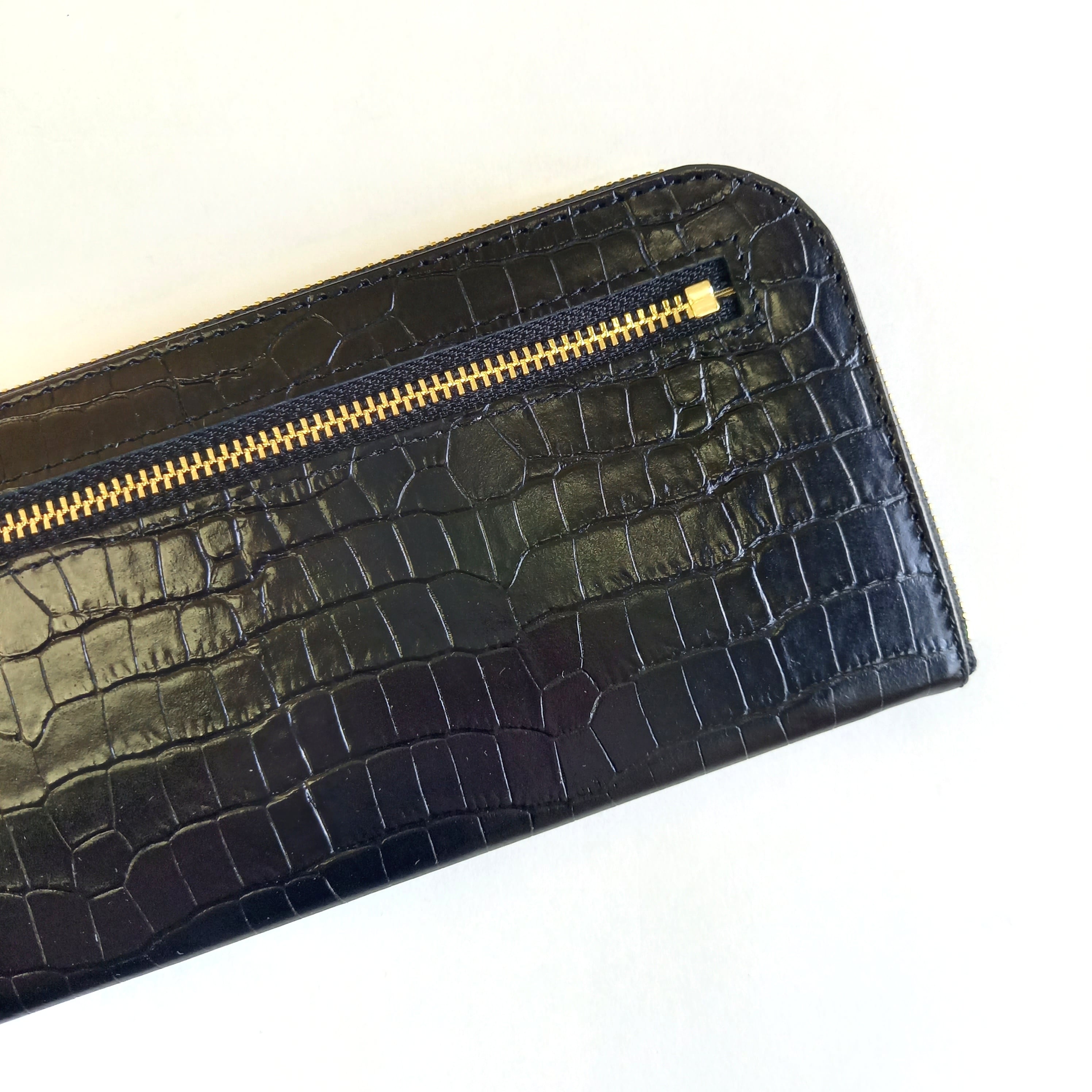 軽くて薄いのに大容量なL字ファスナー長財布◇牛革クロコ型押し(ブラック) カード入れは14か所!【かわつむ】