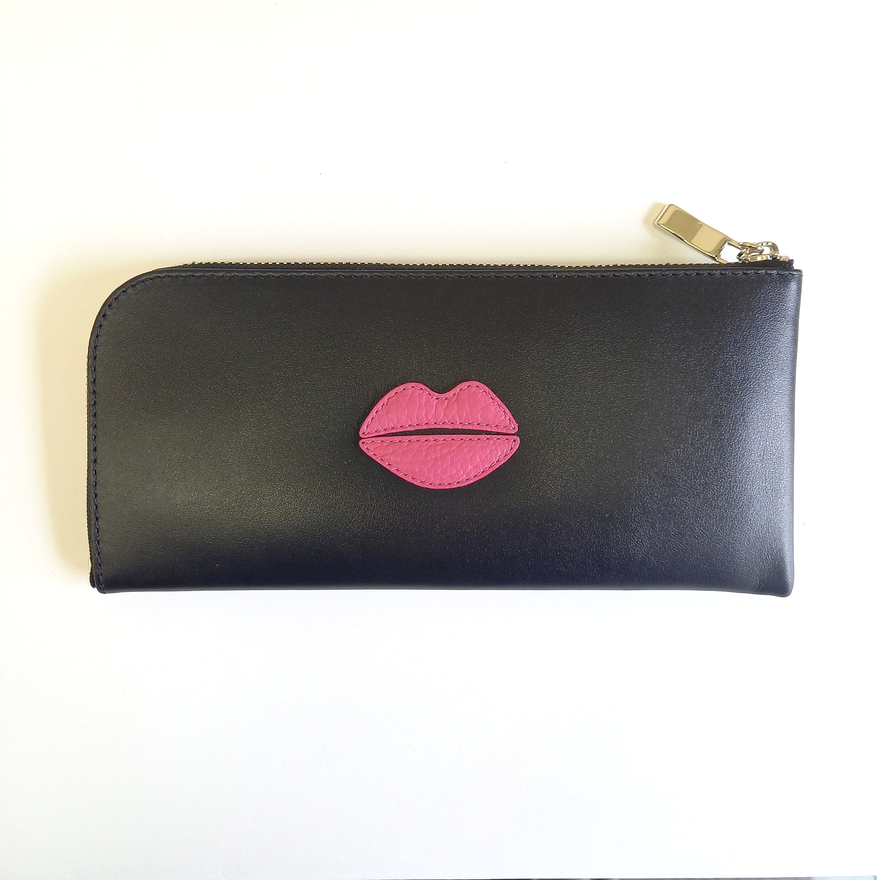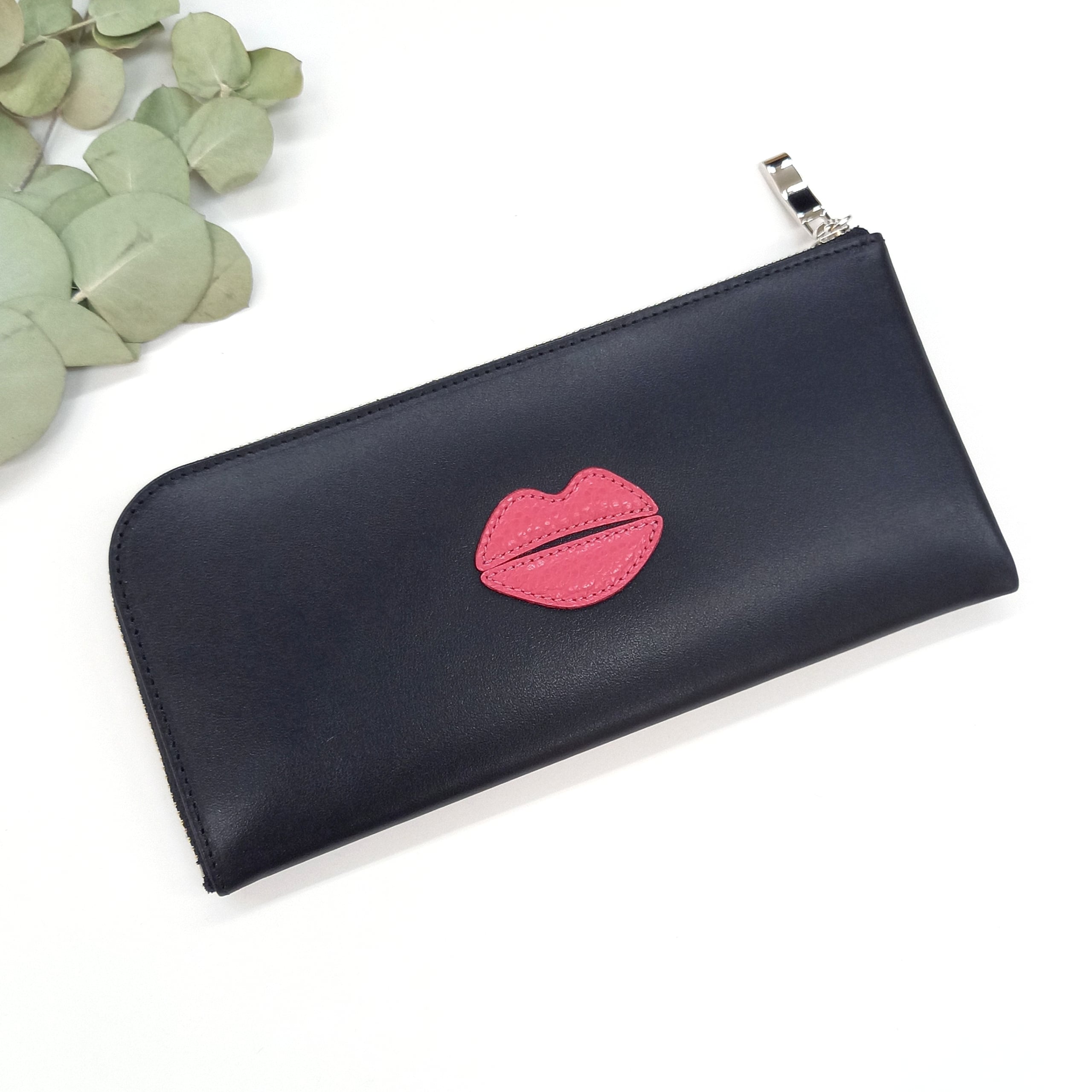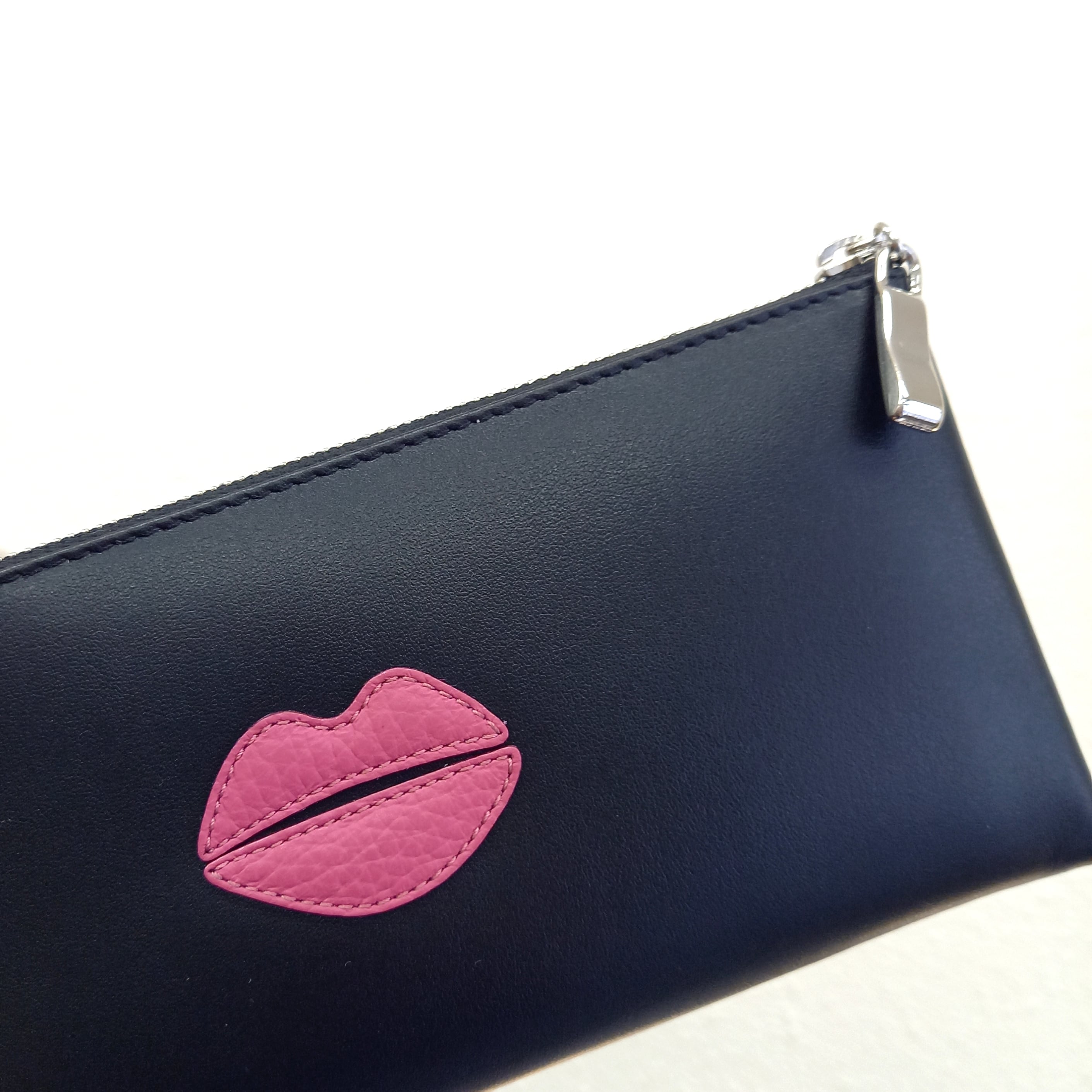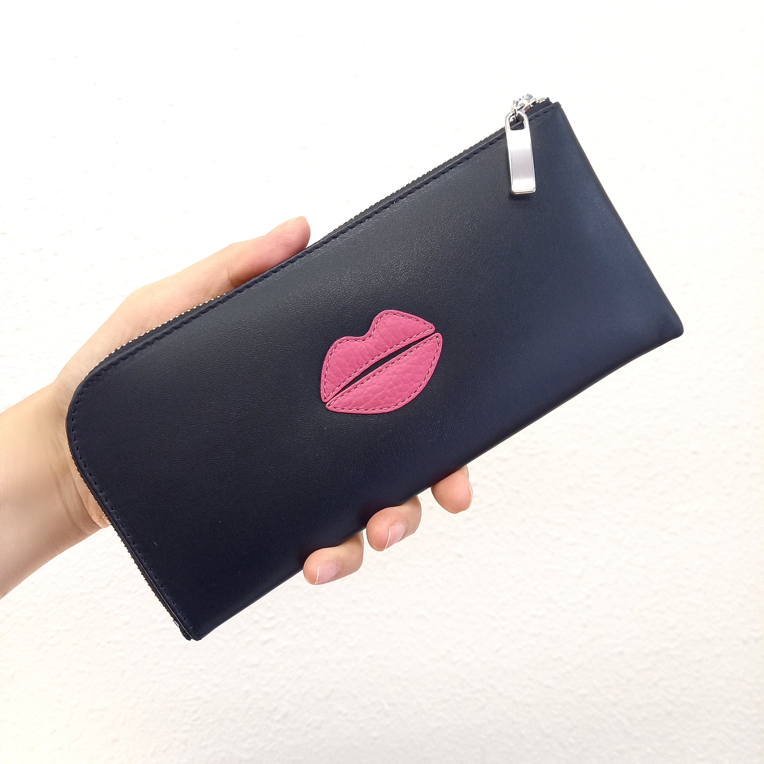 さらっとした高級スムースレザーに、ピンクのクチビルモチーフを付けました。