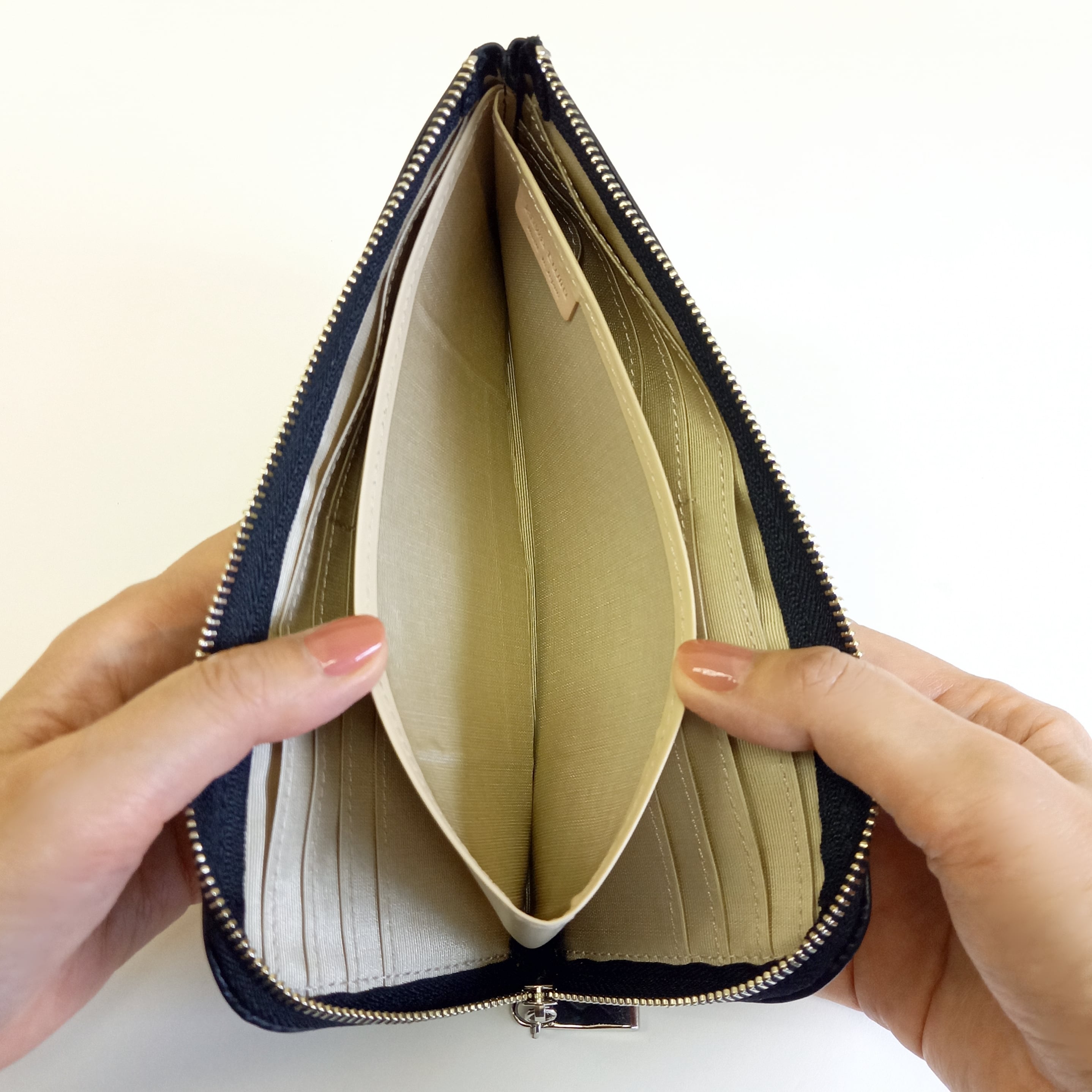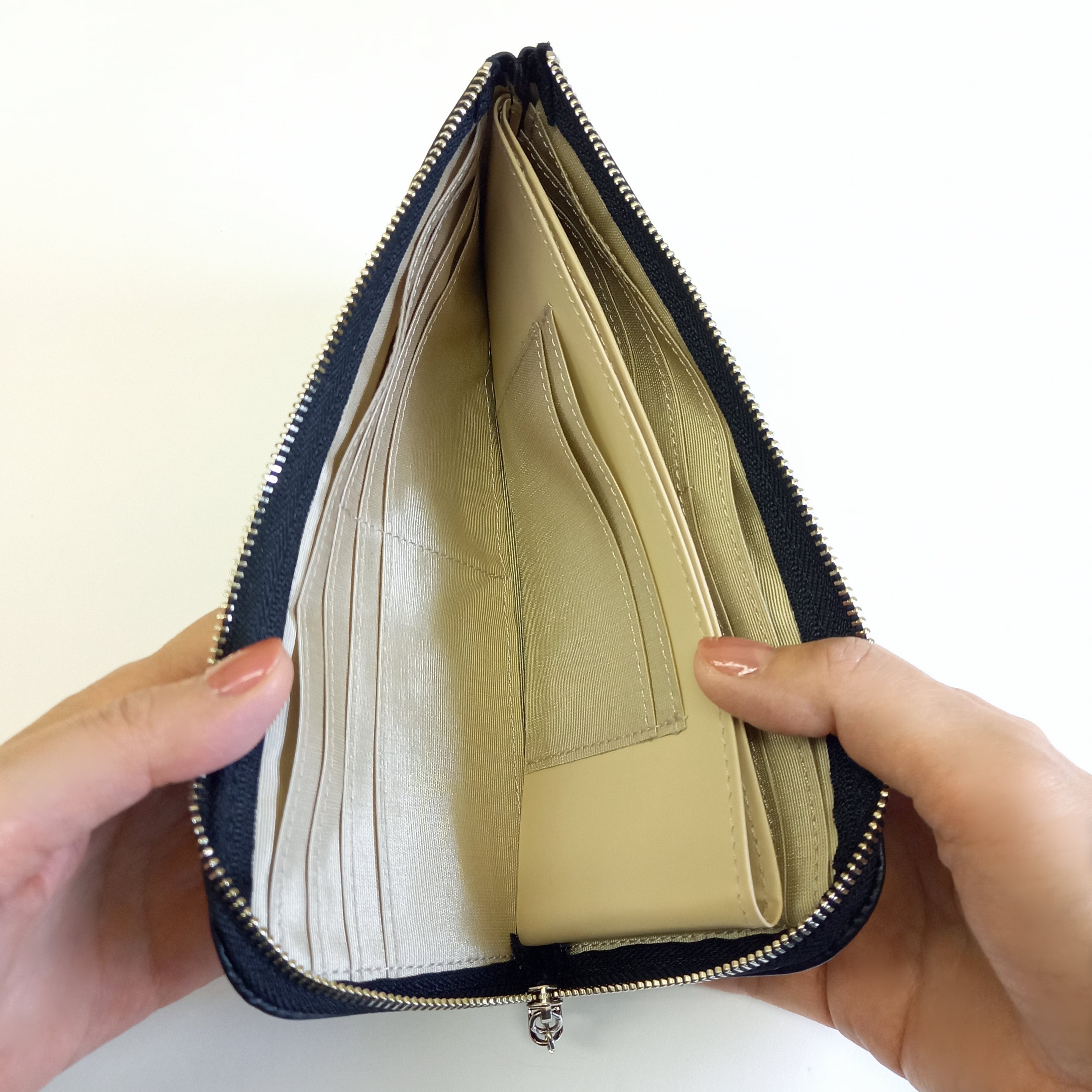 ファスナーを閉じれば、逆さにしても、振っても、小銭が別の場所にこぼれにくい作りになっています。